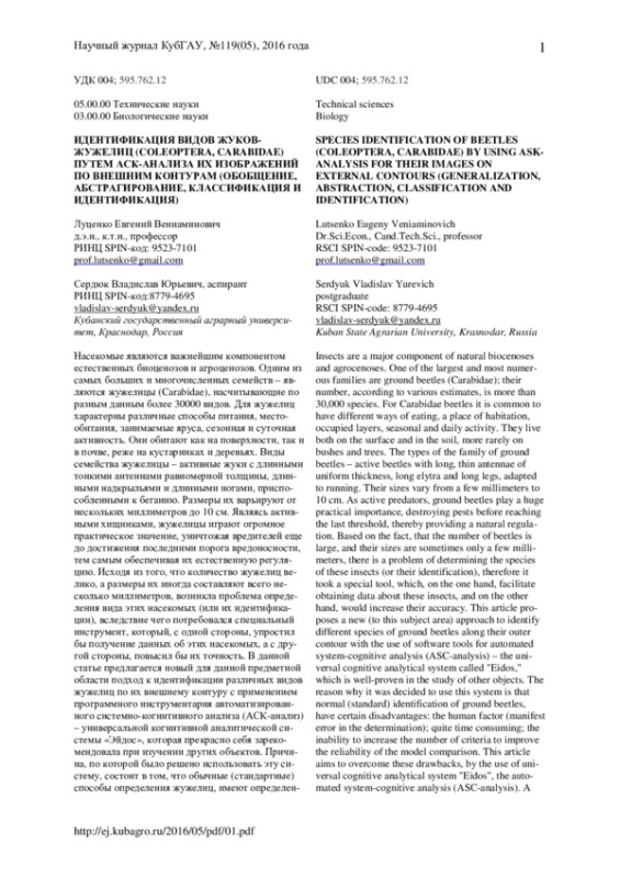 Насекомые являются важнейшим компонентом естественных биоценозов и агроценозов. Одним из самых больших и многочисленных семейств - являются жужелицы (Carabidae), насчитывающие по разным данным более 30000 видов. Для жужелиц характерны различные способы питания, местообитания, занимаемые яруса, сезонная и суточная активность. Они обитают как на поверхности, так и в почве, реже на кустарниках и деревьях. Виды семейства жужелицы - активные жуки с длинными тонкими антеннами равномерной толщины, длинными надкрыльями и длинными ногами, приспособленными к беганию. Размеры их варьируют от нескольких миллиметров до 10 см. Являясь активными хищниками, жужелицы играют огромное практическое значение, уничтожая вредителей еще до достижения последними порога вредоносности, тем самым обеспечивая их естественную регуляцию. Исходя из того, что количество жужелиц велико, а размеры их иногда составляют всего несколько миллиметров, возникла проблема определения вида этих насекомых (или их идентификации), вследствие чего потребовался специальный инструмент, который, с одной стороны, упростил бы получение данных об этих насекомых, а с другой стороны, повысил бы их точность. В данной статье предлагается новый для данной предметной области подход к идентификации различных видов жужелиц по их внешнему контуру с применением программного инструментария автоматизированного системно-когнитивного анализа (АСК-анализ) - универсальной когнитивной аналитической системы «Эйдос», которая прекрасно себя зарекомендовала при изучении других объектов. Причина, по которой было решено использовать эту систему, состоит в том, что обычные (стандартные) способы определения жужелиц, имеют определенные недостатки: человеческий фактор (явные ошибки при определении); достаточно большие временные затраты; невозможность увеличения количества критериев для повышения достоверности модели сравнения. Данная статья направлена на преодоление этих недостатков, путем использования универсальной когнитивной аналитической системы «Эйдос», автоматизированного системно-когнитивного анализа (АСК-анализ). Приводится численный пример.
