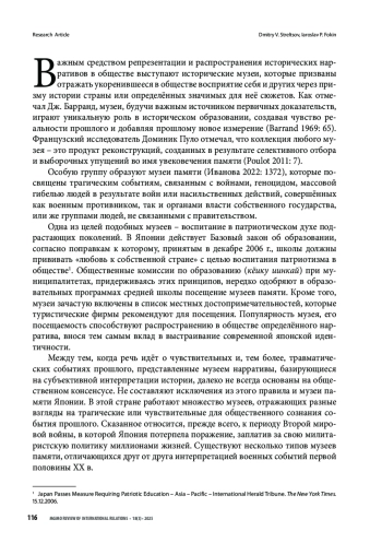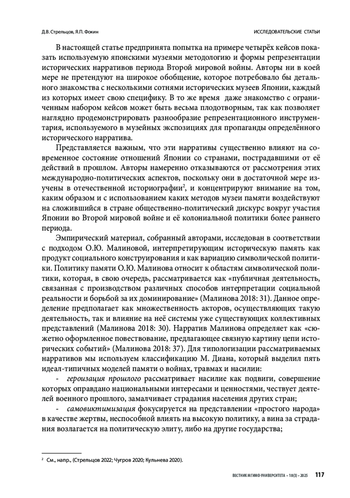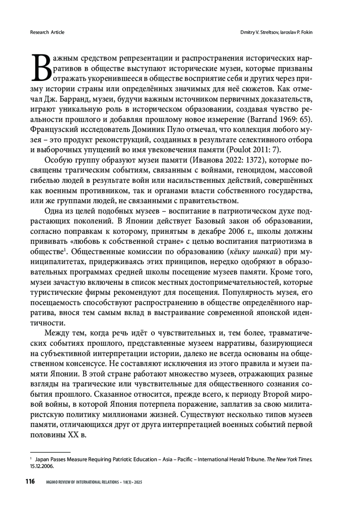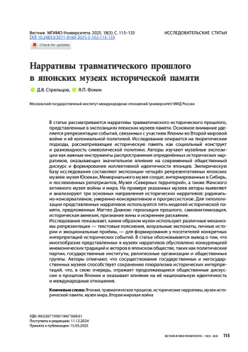СТРЕЛЬЦОВ Д. В., ФОКИН Я. П. НАРРАТИВЫ ТРАВМАТИЧЕСКОГО ПРОШЛОГО В ЯПОНСКИХ МУЗЕЯХ ИСТОРИЧЕСКОЙ ПАМЯТИ // ВЕСТНИК МГИМО-УНИВЕРСИТЕТА. 2025. ТОМ 18, № 3