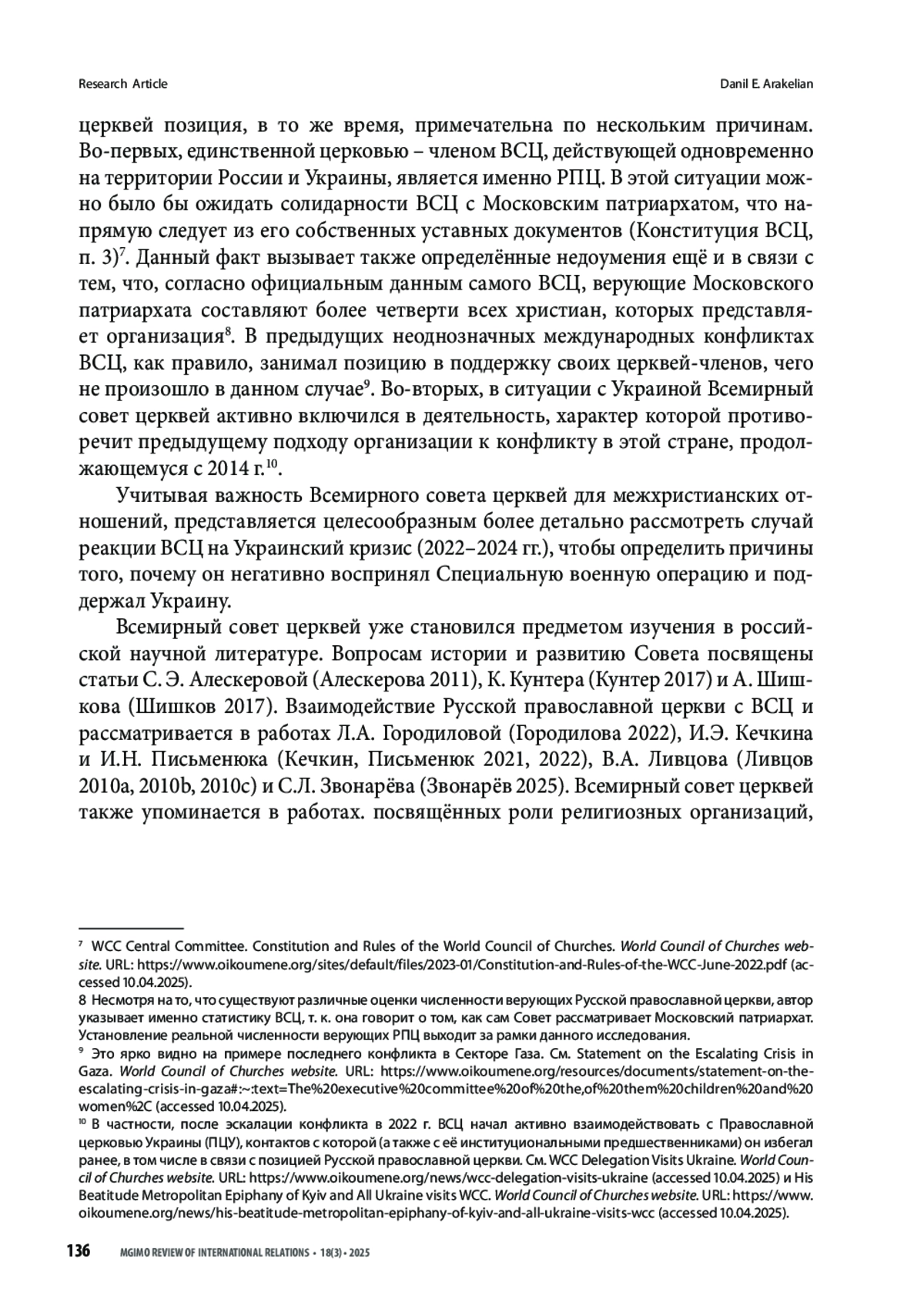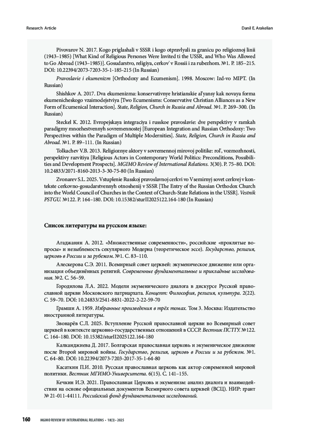 17. Звонарёв С.Л. 2025. Вступление Русской православной церкви во Всемирный совет церквей в контексте церковно-государственных отношений в СССР. Вестник ПСТГУ. №122. С. 164-180. https://doi.org/10.15382/sturII2025122.164-180