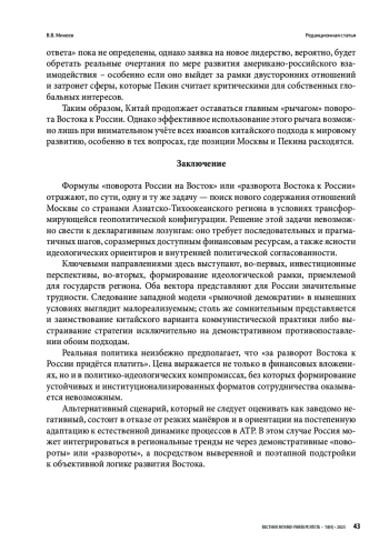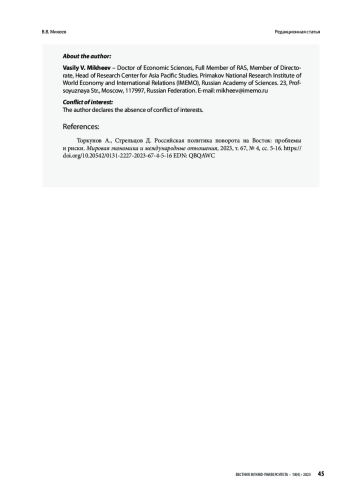 1. Торкунов А., Стрельцов Д. Российская политика поворота на Восток: проблемы и риски. Мировая экономика и международные отношения, 2023, т. 67, № 4, сс. 5-16. https://doitps://doi.org/doi.org/10.20542/0131-2227-2023-67-4-5-16 EDN: QBQAWC