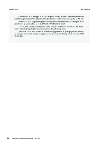 17. Yanano Mangani D. 2024. BRICS as a Catalyst for Global Governance Transformation: Beyond Western Perceptions. MGIMO Review of International Relations. 17(1). P. 46-64. https://doi.org/10.24833/2071-8160-2024-1-94-46-64