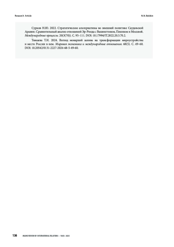 25. Сурков Н.Ю. 2022. Стратегические альтернативы во внешней политике Саудовской Аравии. Сравнительный анализ отношений Эр-Рияда с Вашингтоном, Пекином и Москвой. Международные процессы. 20(3(70)). С. 95-111. https://doi.org/10.17994/IT.2022.20.3.70.2.