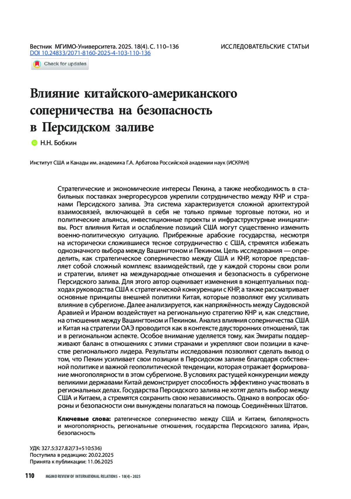 Стратегические и экономические интересы Пекина, а также необходимость в стабильных поставках энергоресурсов укрепили сотрудничество между КНР и странами Персидского залива. Эта система характеризуется сложной архитектурой взаимосвязей, включающей в себя не только прямые торговые потоки, но и политические альянсы, инвестиционные проекты и инфраструктурные инициативы. Рост влияния Китая и ослабление позиций США могут существенно изменить военно-политическую ситуацию. Прибрежные арабские государства, несмотря на исторически сложившиеся тесное сотрудничество с США, стремятся избежать однозначного выбора между Вашингтоном и Пекином. Цель исследования — определить, как стратегическое соперничество между США и КНР, которое представляет собой сложный комплекс взаимодействий, где у каждой стороны свои роли и стратегии, влияет на международные отношения и безопасность в субрегионе Персидского залива. Для этого автор оценивает изменения в концептуальных подходах руководства США к стратегической конкуренции с КНР, а также рассматривает основные принципы внешней политики Китая, которые позволяют ему усиливать влияние в субрегионе. Далее анализируется, как напряжённость между Саудовской Аравией и Ираном воздействует на региональную стратегию КНР и, как следствие, на отношения между Вашингтоном и Пекином. Анализ влияния соперничества США и Китая на стратегии ОАЭ проводится как в контексте двусторонних отношений, так и в региональном аспекте. Особое внимание уделяется тому, как Эмираты поддерживают баланс в отношениях с этими странами и укрепляют свои позиции в качестве регионального лидера. Результаты исследования позволяют сделать вывод о том, что Пекин усиливает свои позиции в Персидском заливе благодаря собственной политике и важной геополитической тенденции, которая отражает формирование многополярности в этом субрегионе. В условиях растущей конкуренции между великими державами Китай демонстрирует способность эффективно участвовать в региональных делах. Государства Персидского залива не хотят делать выбор между США и Китаем, а стремятся сохранить свою независимость. Однако в вопросах обороны и безопасности они вынуждены полагаться на помощь Соединённых Штатов.