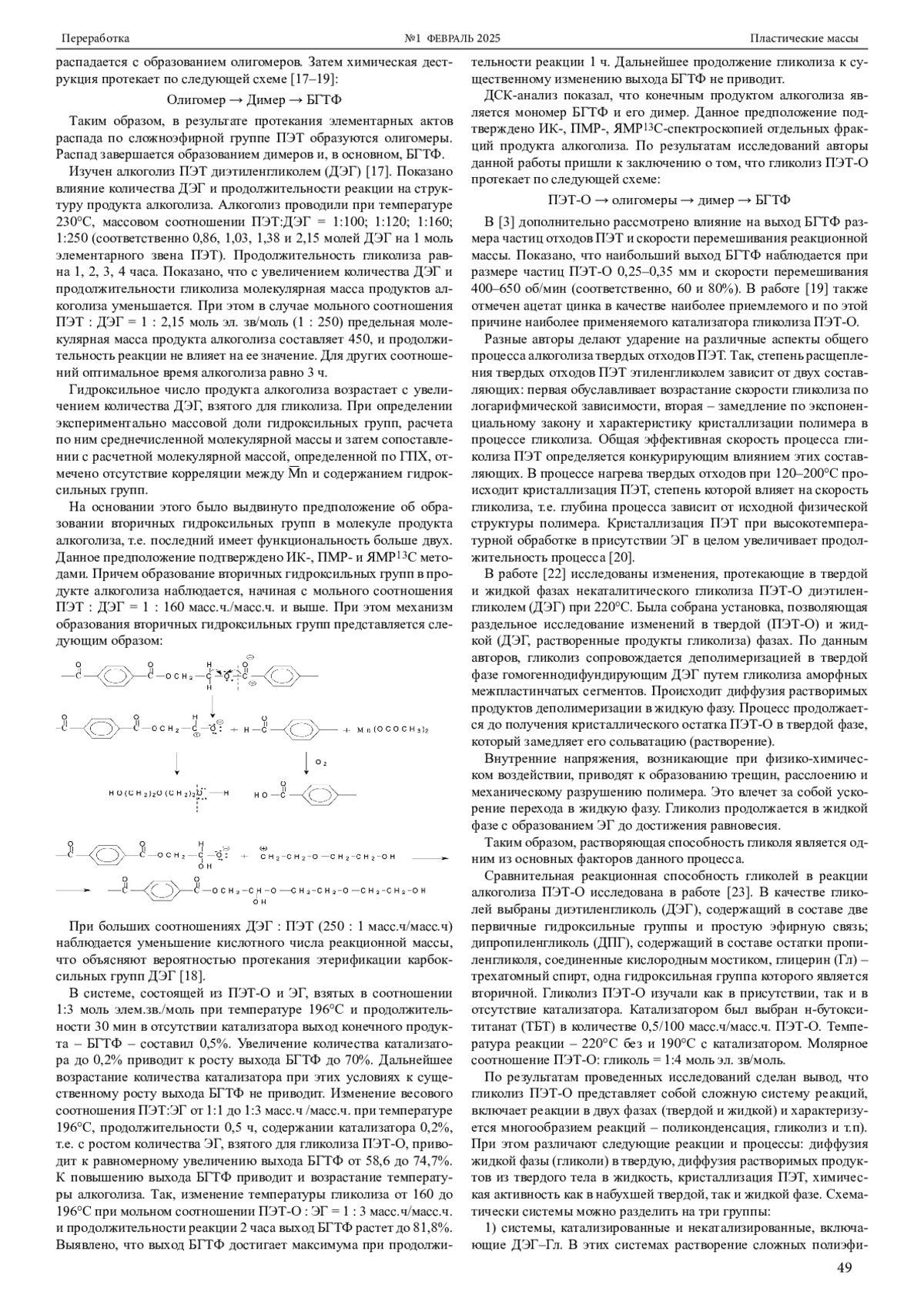 Один из наиболее распространенных видов упаковки – бутылки из полиэтилентерефталата (ПЭТ) – в больших количествах скапливается на свалках. Поэтому переработка бытовых отходов, содержащих ПЭТ, считается одной из возможностей решения важной экологической проблемы за счет сокращения их количества. Химическая утилизация ПЭТ-бутылок, в частности, гликолиз, является экологически чистой реакцией, поскольку не образует остатков. Степень деградации вторичного ПЭТ при гликолизе зависит, в частности, от природы катализатора [1–3].