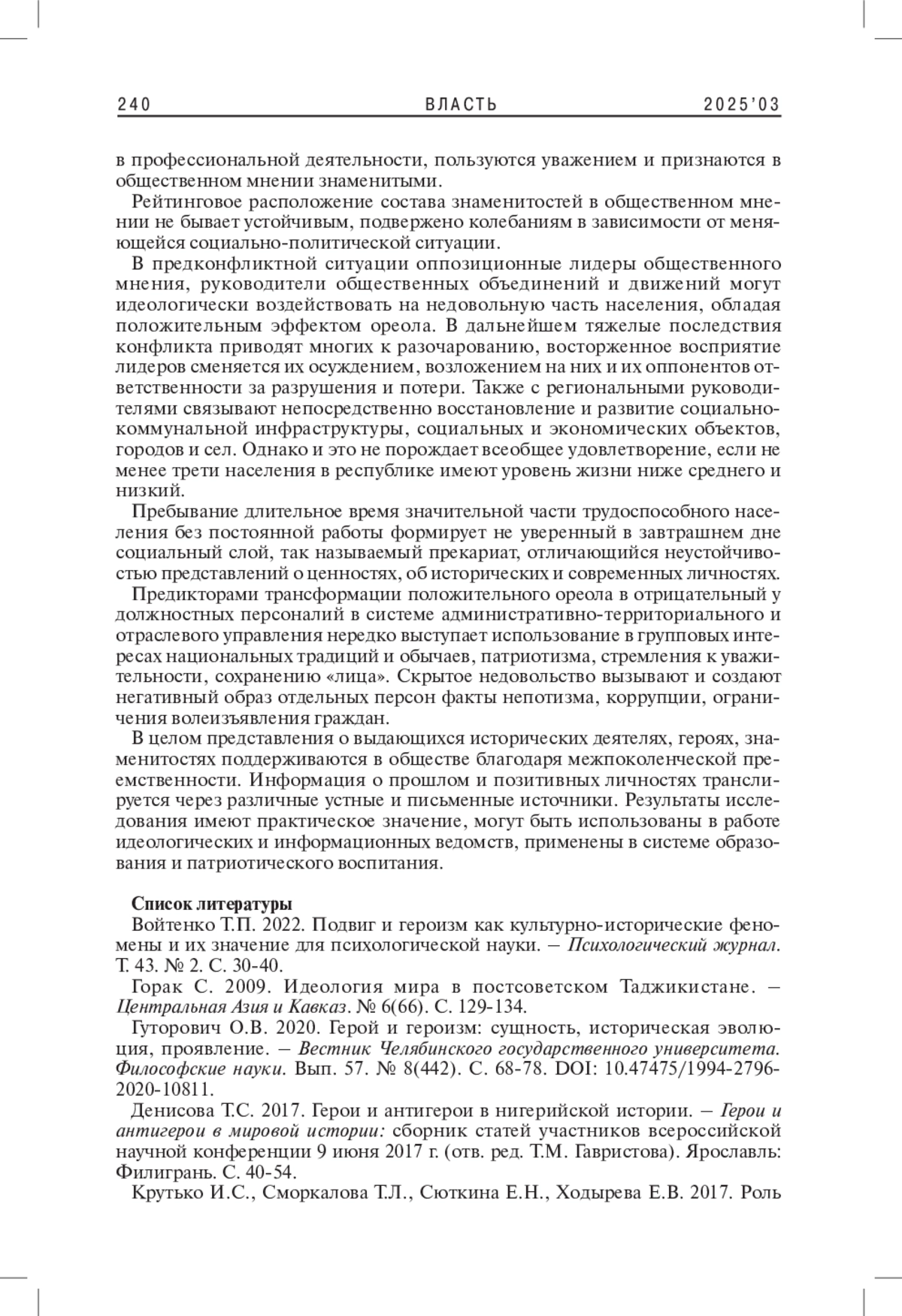 1. Войтенко Т.П. 2022. Подвиг и героизм как культурно-исторические феномены и их значение для психологической науки. - Психологический журнал. Т. 43. № 2. С. 30-40. EDN: MHJZQK