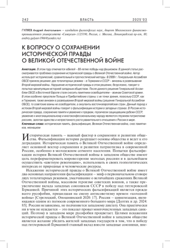 В этом году отмечается юбилей - 80-летие победы над фашизмом. В данной статье рассматривается проблема сохранения исторической правды о Великой Отечественной войне. Автор использует исторический, сравнительный и прогностический методы. В 2009 г. Генеральная Ассамблея ОБСЕ приняла решение: два тоталитарных режима - в Германии и СССР - виновны в развязывании Второй мировой войны. Нарушение исторической правды в этом решении, безусловно, говорит о попытках манипуляции историей западным обществом. После данного решения Генеральной Ассамблеи ОБСЕ в Восточной Европе стали сносить памятники освободителям - воинам Советской армии. В этом особенно преуспели Польша и Прибалтийские страны: с их точки зрения, поскольку СССР, как и Германия, также виновен в развязывании Второй мировой войны (решение Генеральной Ассамблеи ОБСЕ), то советские воины не освободители, а оккупанты восточноевропейских стран. Данный подход к истокам Второй мировой войны говорит о фальсификации истории в западных странах. В России историческая правда, сохранение памяти и уважение к предкам, героически защищавшим рубежи СССР, уважение к многонациональному и многоконфессиональному народу являются стержнем патриотизма россиян, залогом единства и непрестанного роста уважительного отношения к России в мире.