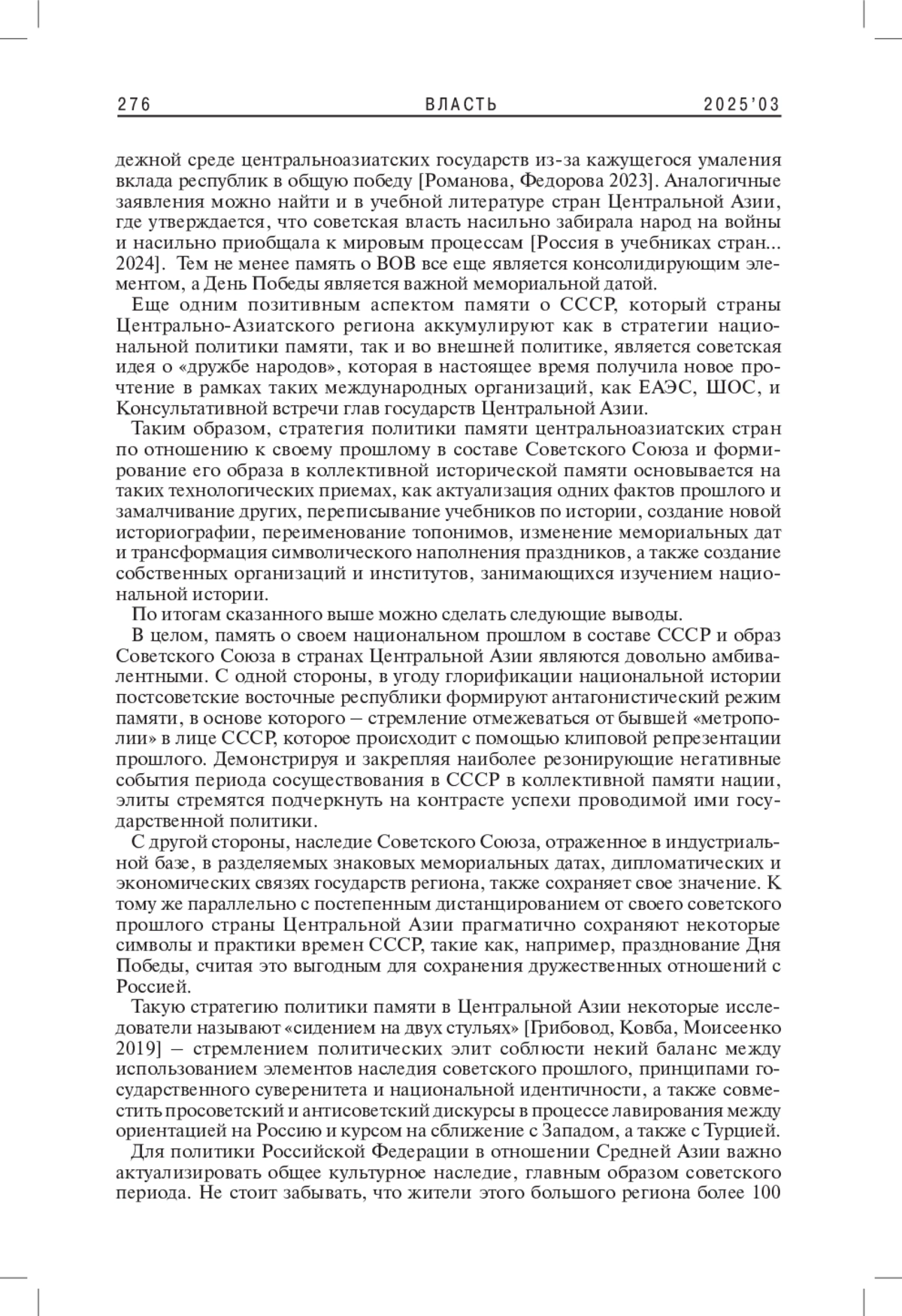 6. Романова А.П., Федорова М.М. 2023. Роль политики памяти в конструировании новых идентичностей в странах Большого Каспия (на примере Республики Казахстан и Республики Туркменистан). - Сравнительная политика. № 14(3). С. 60-78. DOI: 10.46272/2221-3279-2023-3-14-60-78 EDN: GKAHDQ