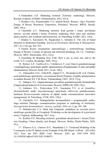16. Родькин П.Е. Брендинг территорий: городская идентичность и дизайн: учеб. пособие. - М.; Берлин: Директ-Медиа, 2020. - 93 с. EDN: FUXBYA