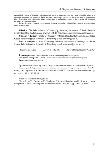 В отечественной научной литературе, посвященной тематике маркетинга территорий, практически не обсуждается вопрос управления системой брендинговых коммуникаций. Преобладает либо культурологический подход, основанный на краеведческом контенте, либо креативный взгляд, представляющий важные для региона идеи, ценности и ключевые маркетинговые сообщения. При всей своей важности подобные разработки должны в последующем иметь продолжение в стратегиях, планах мероприятий, бюджетных решениях. Для этого должна быть создана управленческая структура, способная принимать и реализовать принятые решения. Как правило, управленческим центром в российской практике становится региональный орган власти (в лице одного из ведомств, обычно так или иначе связанного с тематикой туризма или инвестиций). Возможные модели управления брендом территорий определяются политико-административным, рыночным и социальным ландшафтом конкретной страны. Иерархическая культура российской административной практики не предполагает иной схемы управления маркетинговой программой, кроме как вписанной в эту вертикаль. Такая модель имеет определенные достоинства, но существуют ограничения и риски. В статье рассмотрены также другие модели, эффективно используемые в практике городов и территорий других стран.