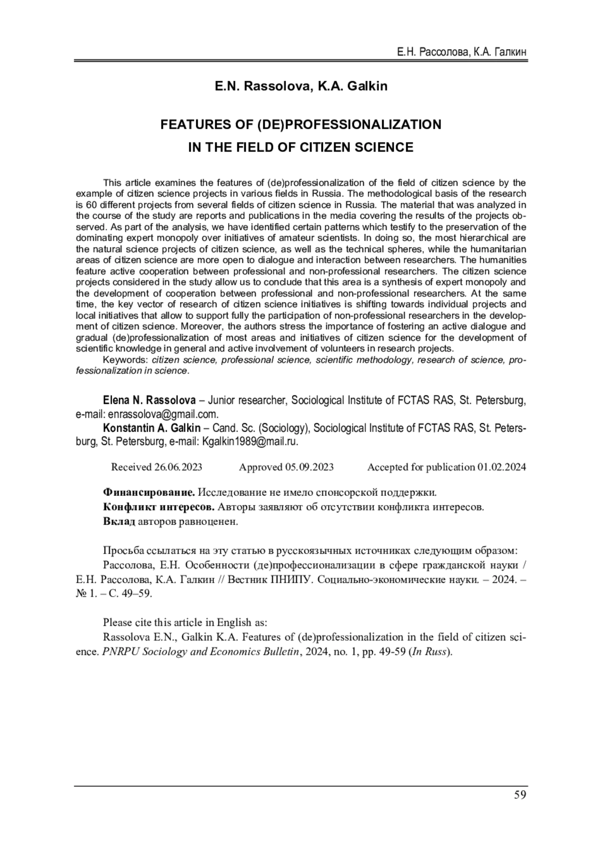 РАССОЛОВА Е. Н., ГАЛКИН К. А. ОСОБЕННОСТИ (ДЕ)ПРОФЕССИОНАЛИЗАЦИИ В СФЕРЕ ГРАЖДАНСКОЙ НАУКИ // ВЕСТНИК ПЕРМСКОГО НАЦИОНАЛЬНОГО ИССЛЕДОВАТЕЛЬСКОГО ПОЛИТЕХНИЧЕСКОГО УНИВЕРСИТЕТА. СОЦИАЛЬНО-ЭКОНОМИЧЕСКИЕ НАУКИ. 2024. № 1