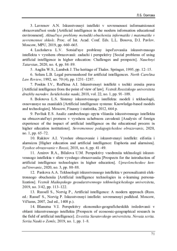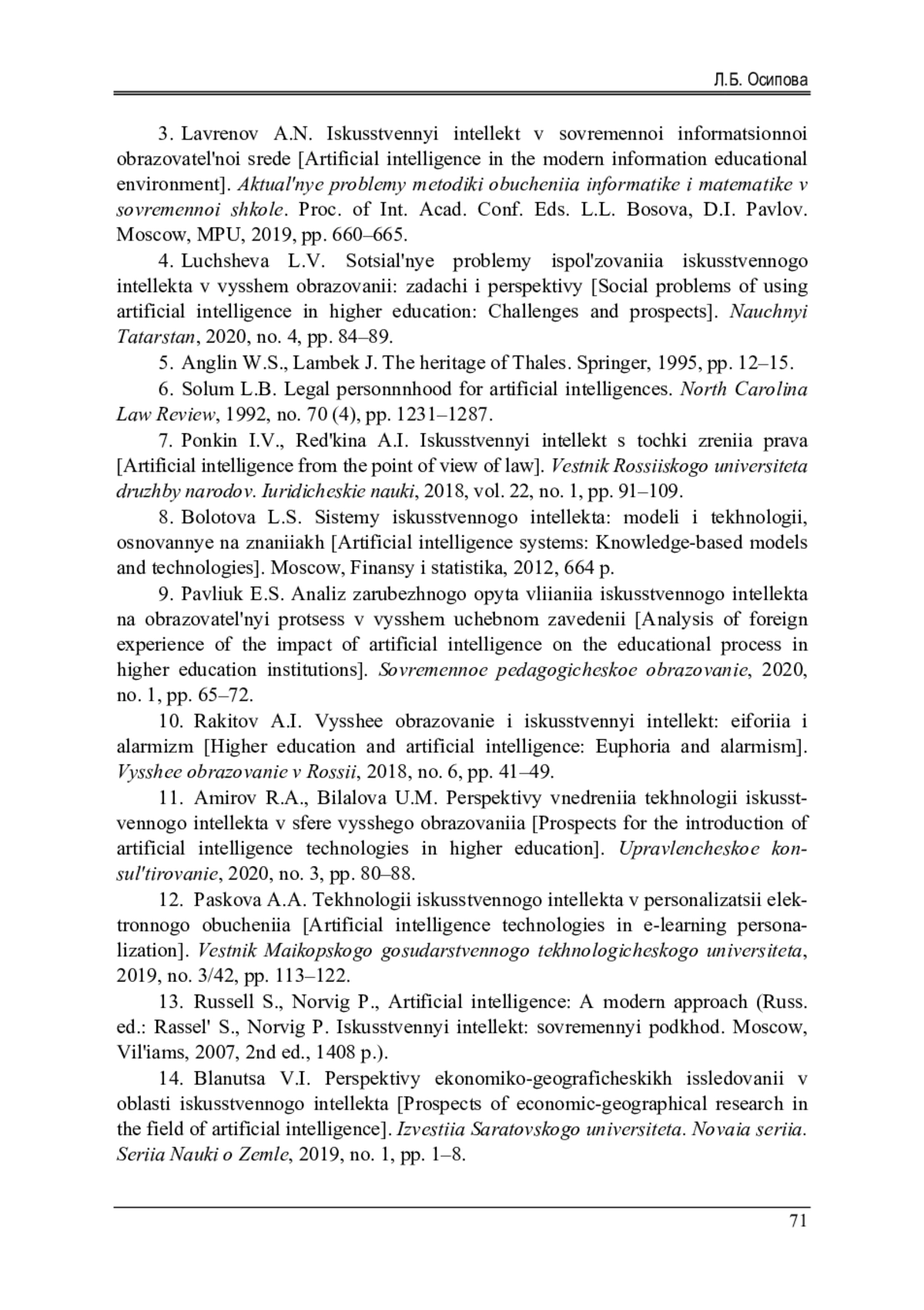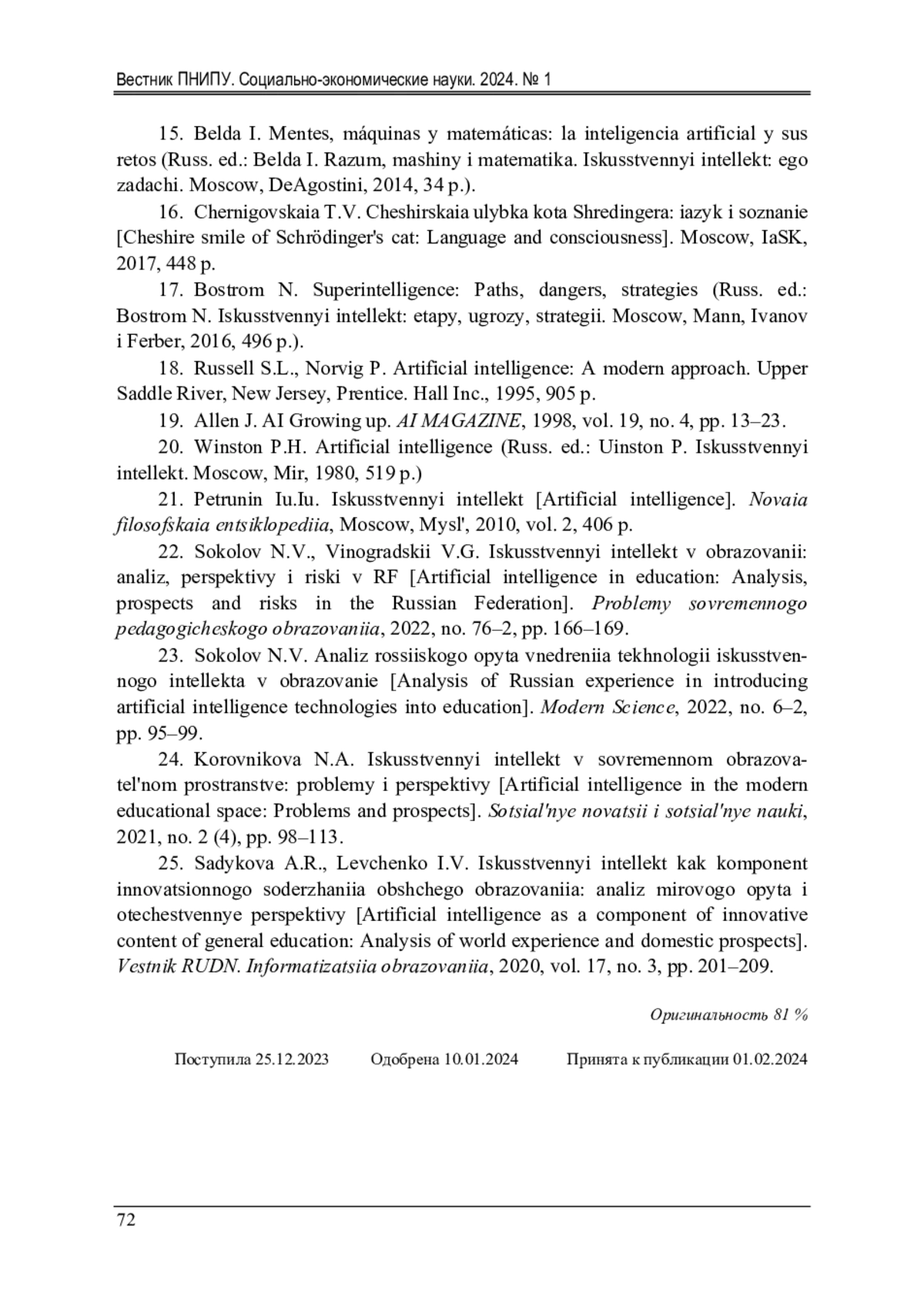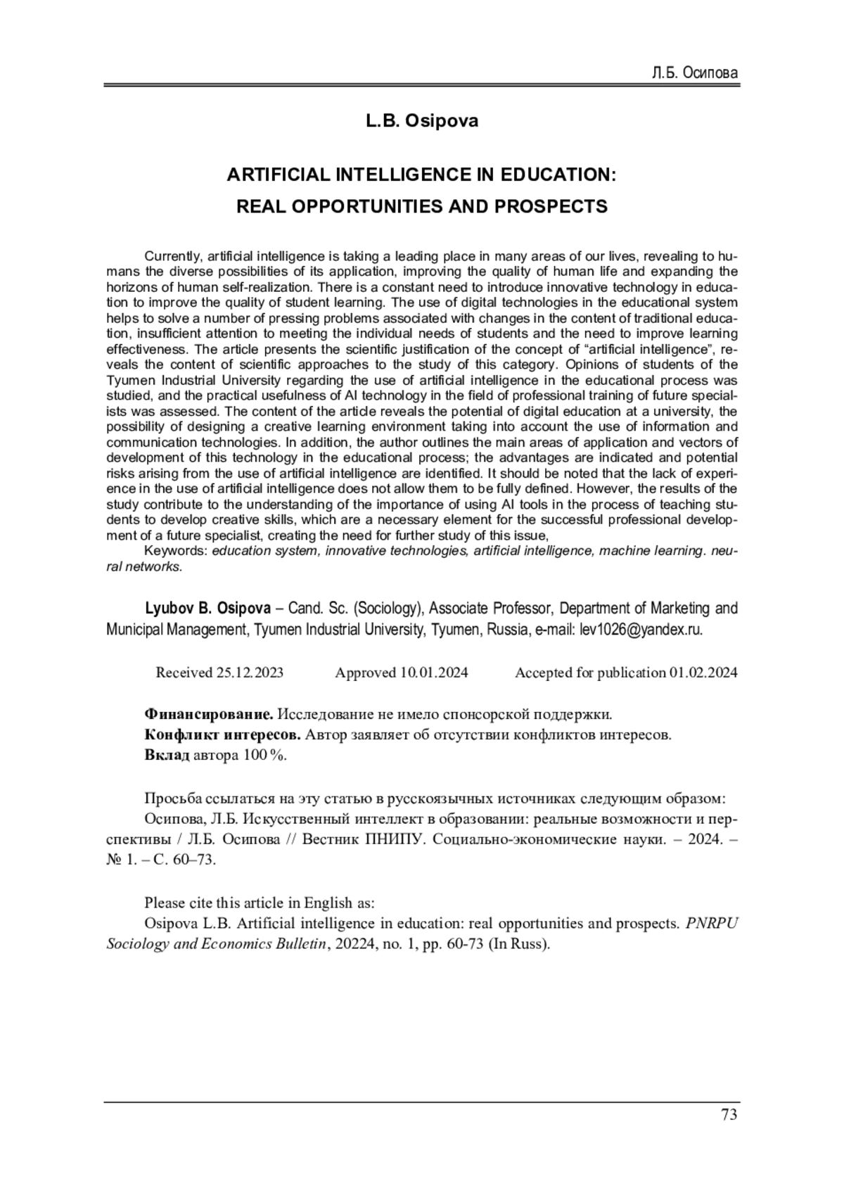 ОСИПОВА Л. Б. ИСКУССТВЕННЫЙ ИНТЕЛЛЕКТ В ОБРАЗОВАНИИ: РЕАЛЬНЫЕ ВОЗМОЖНОСТИ И ПЕРСПЕКТИВЫ // ВЕСТНИК ПЕРМСКОГО НАЦИОНАЛЬНОГО ИССЛЕДОВАТЕЛЬСКОГО ПОЛИТЕХНИЧЕСКОГО УНИВЕРСИТЕТА. СОЦИАЛЬНО-ЭКОНОМИЧЕСКИЕ НАУКИ. 2024. № 1