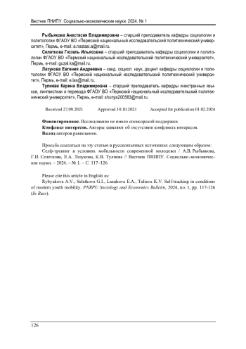 РЫБЬЯКОВА А. В., СЕЛЕТКОВА Г. И., ЛАЗУКОВА Е. А., ТУЛИЕВА К. В. СЕЛФ-ТРЕКИНГ В УСЛОВИЯХ МОБИЛЬНОСТИ СОВРЕМЕННОЙ МОЛОДЕЖИ // ВЕСТНИК ПЕРМСКОГО НАЦИОНАЛЬНОГО ИССЛЕДОВАТЕЛЬСКОГО ПОЛИТЕХНИЧЕСКОГО УНИВЕРСИТЕТА. СОЦИАЛЬНО-ЭКОНОМИЧЕСКИЕ НАУКИ. 2024. № 1