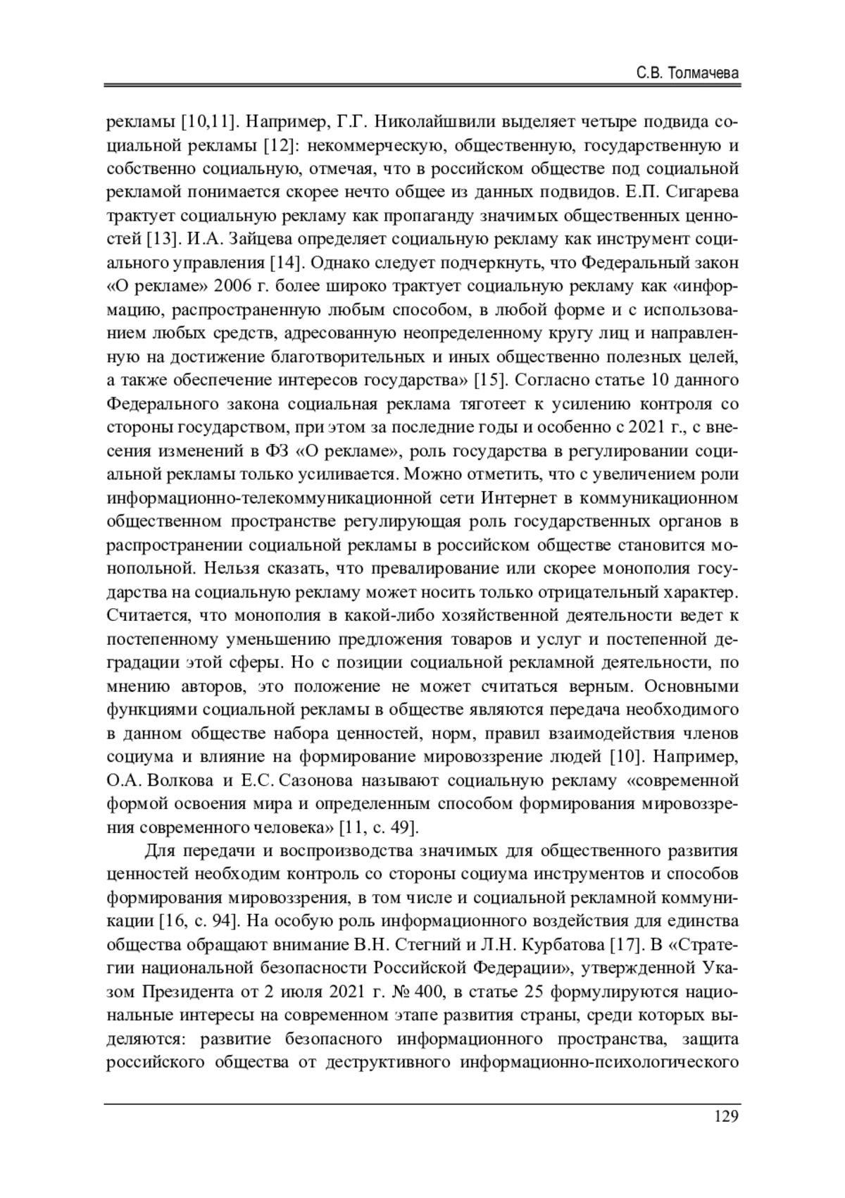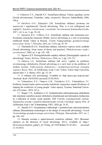 14. Зайцева И.А. Социальная реклама как новый взгляд на проблемы современного общества // Цифровизация общества и медиаобразовательная стратегия регионов России: материалы Всерос. науч. конф. - Елец: Изд-во Елец. гос. ун-та, 2021. - С. 32-36. EDN: JVETXG
