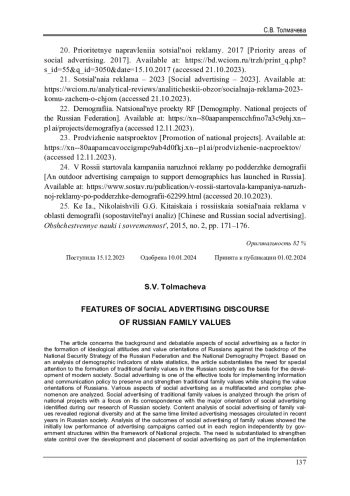 8. Автаева Н.О. Семейные ценности в рекламном дискурсе телевидения и интернета // Вестник ВГУ. Филология. Журналистика. - 2022. - № 4. - С. 64-72. EDN: AOAUXU