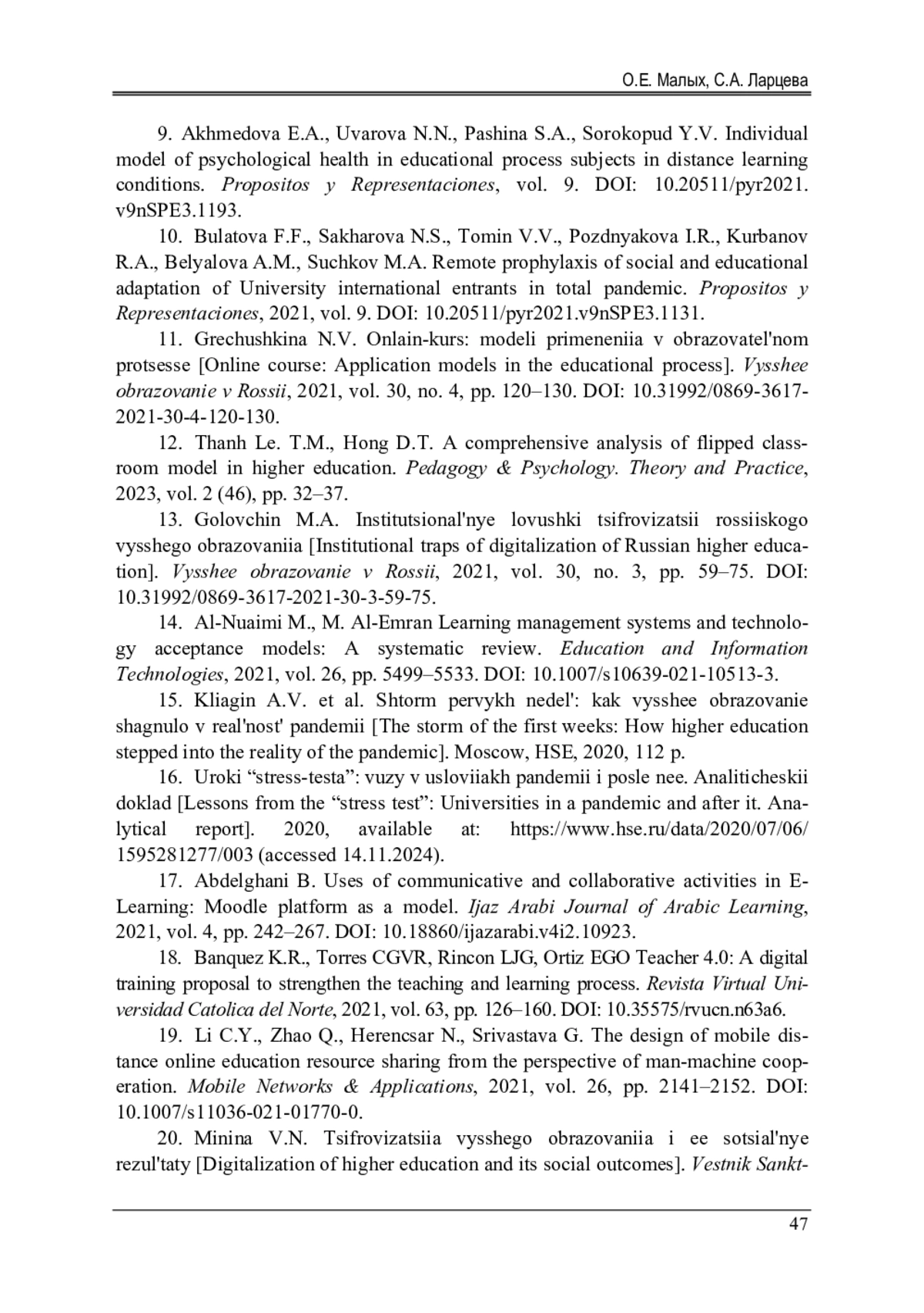 9. Individual Model of Psychological Health in Educational Process Subjects in Distance Learning Conditions / E.А. Akhmedova, N.N. Uvarova, S.A. Pashina, Y.V. Sorokopud // Propositos y Representaciones. - Vol. 9. - Special Issue. DOI: 10.20511/pyr2021.v9nSPE3.1193 EDN: FYCJOF