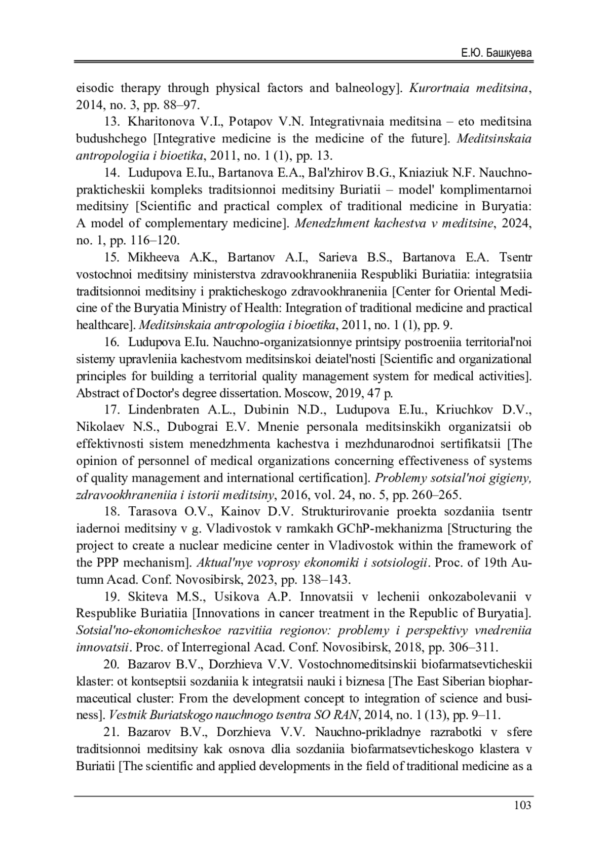 14. Научно-практический комплекс традиционной медицины Бурятии - модель комплиментарной медицины / Е.Ю. Лудупова, Е.А. Бартанова, Б.Г. Бальжиров, Н.Ф. Князюк // Менеджмент качества в медицине. - 2024. - № 1. - С. 116-120. EDN: NYARMU