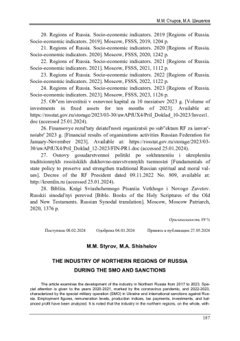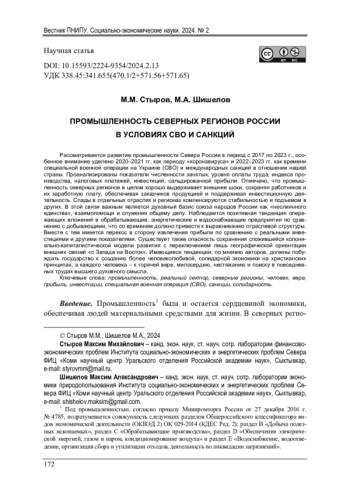 СТЫРОВ М. М., ШИШЕЛОВ М. А. ПРОМЫШЛЕННОСТЬ СЕВЕРНЫХ РЕГИОНОВ РОССИИ В УСЛОВИЯХ СВО И САНКЦИЙ // ВЕСТНИК ПЕРМСКОГО НАЦИОНАЛЬНОГО ИССЛЕДОВАТЕЛЬСКОГО ПОЛИТЕХНИЧЕСКОГО УНИВЕРСИТЕТА. СОЦИАЛЬНО-ЭКОНОМИЧЕСКИЕ НАУКИ. 2024. № 2