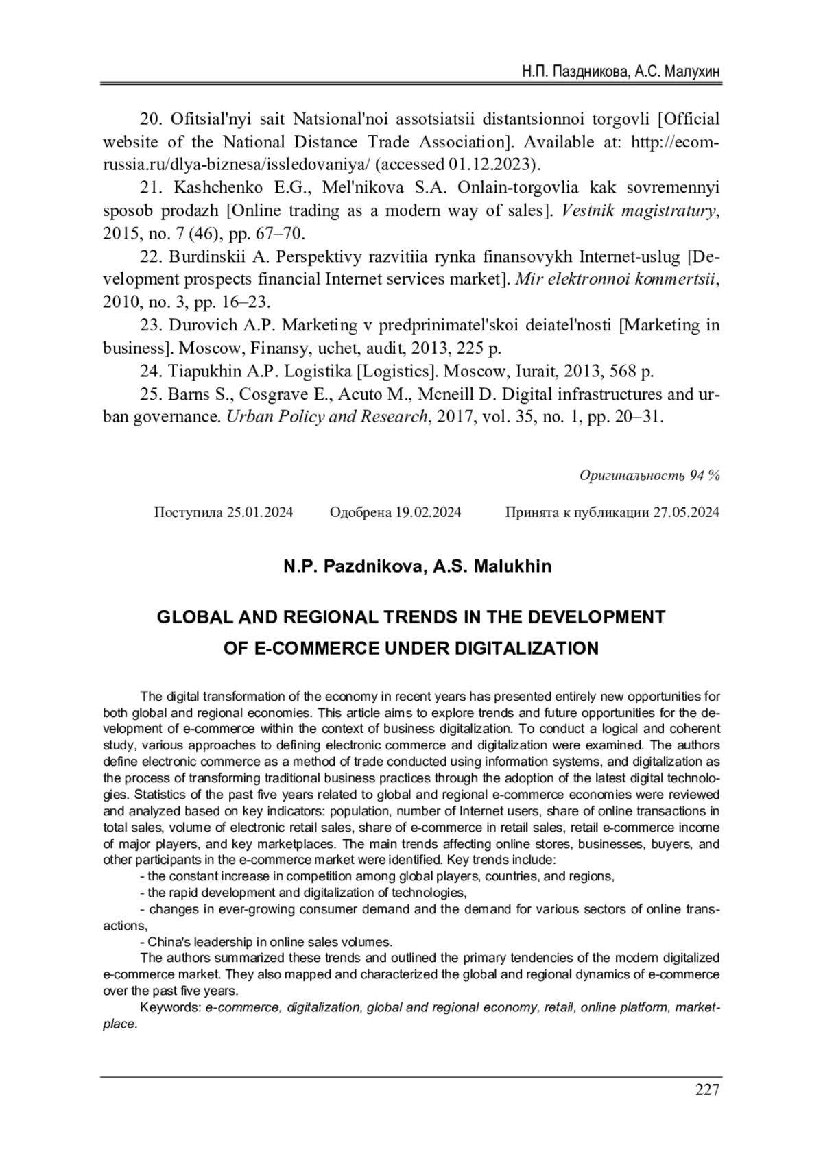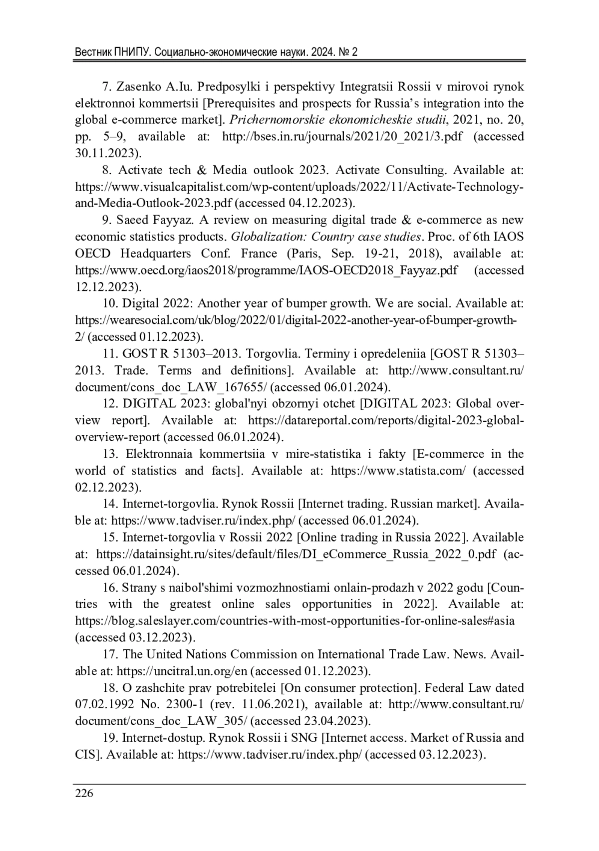 ПАЗДНИКОВА Н. П., МАЛУХИН А. С. ТЕНДЕНЦИИ РАЗВИТИЯ ЭЛЕКТРОННОЙ КОММЕРЦИИ В УСЛОВИЯХ ДИДЖИТАЛИЗАЦИИ: ТРЕНДЫ РЕГИОНАЛЬНОЙ И МИРОВОЙ ЭКОНОМИКИ // ВЕСТНИК ПЕРМСКОГО НАЦИОНАЛЬНОГО ИССЛЕДОВАТЕЛЬСКОГО ПОЛИТЕХНИЧЕСКОГО УНИВЕРСИТЕТА. СОЦИАЛЬНО-ЭКОНОМИЧЕСКИЕ НАУКИ. 2024. № 2