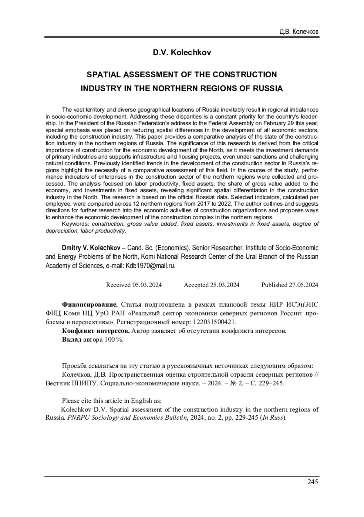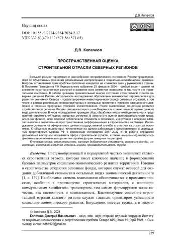 Большой размер территории и разнообразие географического положения России предопределяет по объективным причинам региональные диспропорции в социально-экономическом развитии. Вопросы сглаживания таких проблем постоянно находится на «повестке дня» у руководства страны. В Послании Президента РФ Федеральному собранию 29 февраля 2024 г. особый акцент сделан на снижение пространственных различий в развитии всех сегментов экономики, в том числе и в строительном комплексе. В работе проведен сравнительный анализ состояния строительной отрасли северных регионов России. Актуальность исследования обусловлена значимостью строительства для развития экономики Севера - удовлетворением инвестиционного спроса основных отраслей, в том числе в рамках реализации инфраструктурных и жилищных проектов в условиях санкционного давления и сложных природных условиях хозяйствования. Ранее выявленные тенденции развития стройкомплекса регионов России свидетельствуют о необходимости сравнительной оценки данного вида деятельности. В ходе исследования проведен сбор, обработка показателей деятельности предприятий строительной сферы северных регионов. В результате оценки производительности труда, основных фондов, доли валовой добавленной стоимости в экономике, инвестиции в основной капитал выявлена значительная пространственная дифференциация в строительстве на Севере. Исследование основано на официальных данных государственной службы статистики из открытых источников. Отобранные индикаторы, исчисленные на одного работающего сопоставляются с двенадцатью территориями Севера РФ с временн ы м интервалом 2017-2022 гг. В работе определен дальнейший вектор исследований в сфере строительной отрасли, а также намечены ориентиры эффективности экономического развития стройиндустрии северных территорий.