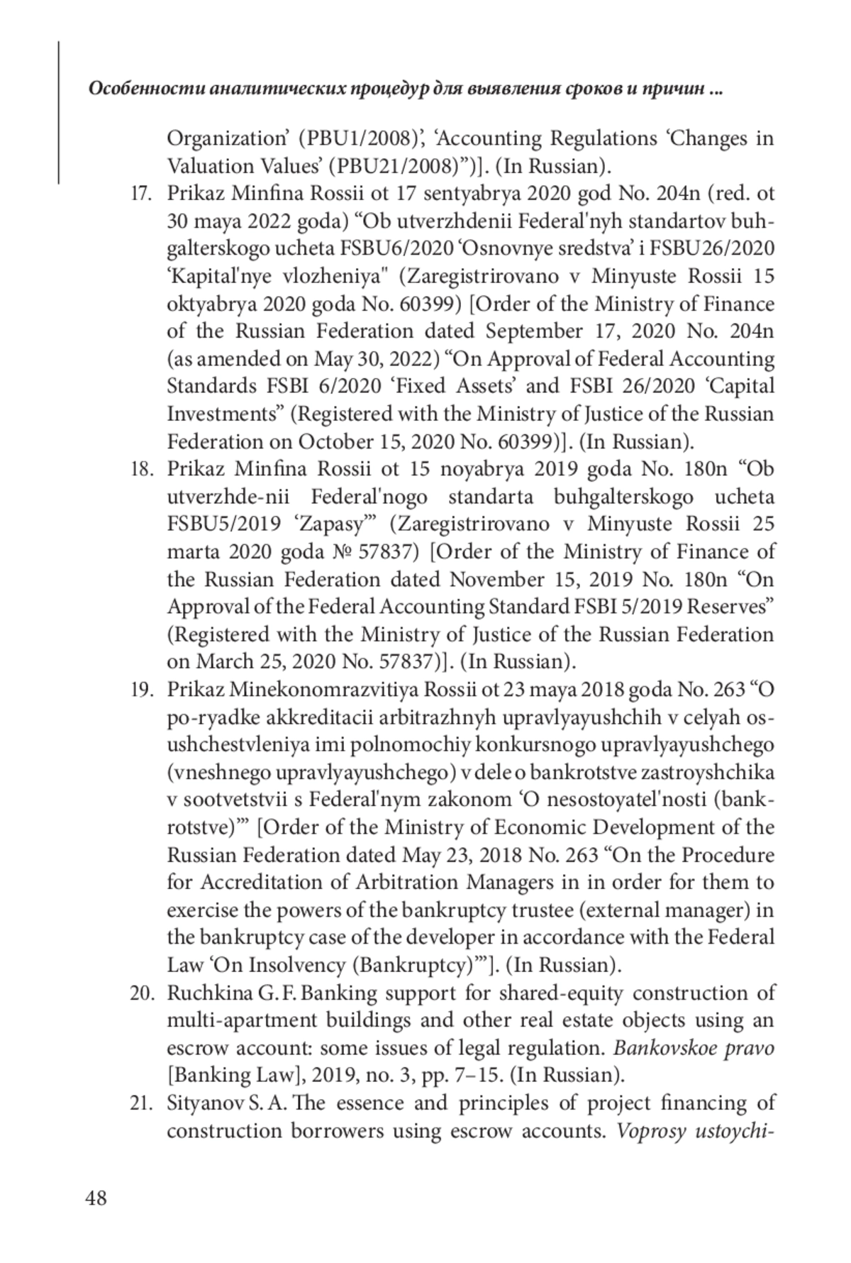 20. Ручкина Г. Ф. Банковское сопровождение долевого строительства многоквартирных домов и иных объектов недвижимости с использованием счета эскроу: некоторые вопросы правового регулирования // Банковское право. 2019. № 3. С. 7-15.