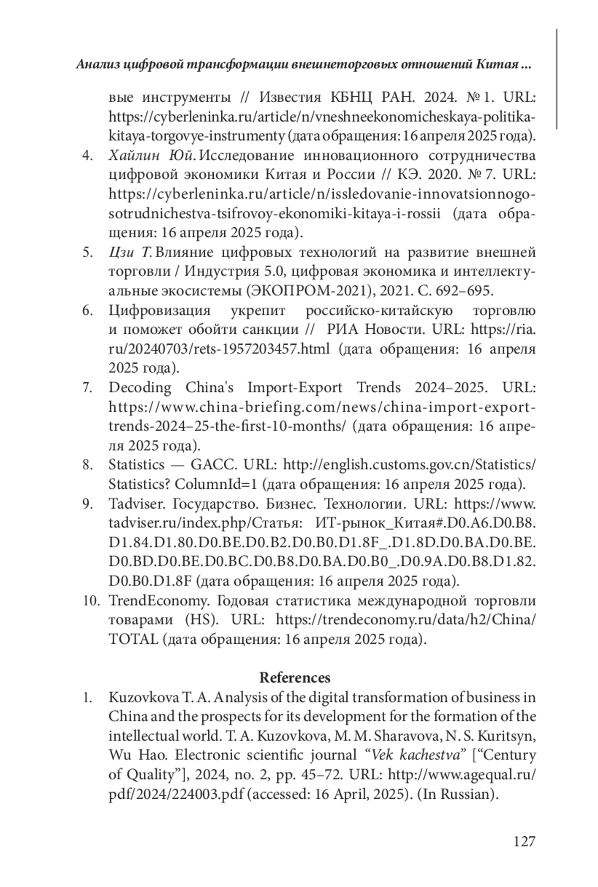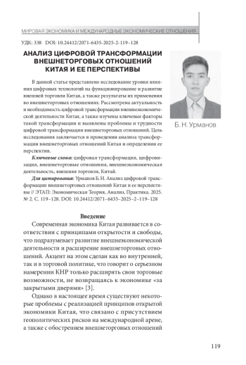 УРМАНОВ Б. Н. АНАЛИЗ ЦИФРОВОЙ ТРАНСФОРМАЦИИ ВНЕШНЕТОРГОВЫХ ОТНОШЕНИЙ КИТАЯ И ЕЕ ПЕРСПЕКТИВЫ // ЭТАП: ЭКОНОМИЧЕСКАЯ ТЕОРИЯ, АНАЛИЗ, ПРАКТИКА. 2025. № 2
