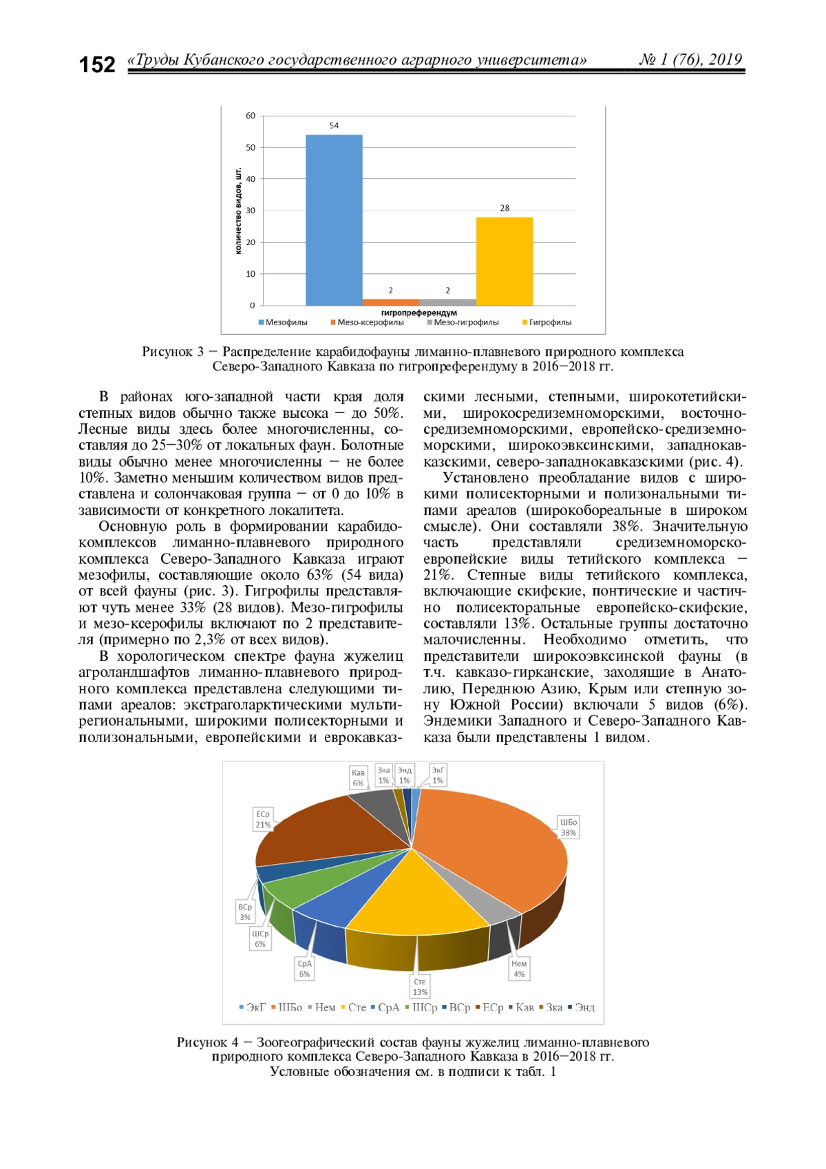 Целью настоящей работы являлось изучение особенностей формирования карабидофауны агролдандшафта, анализ спектра жизненных форм, хорологических комплексов и типов ареала, а также биотопического преферендума видов в условиях лиманно-плавневого природного комплекса Северо-Западного Кавказа в 2016-2018 гг. По результатам наблюдений установлено высокое разнообразие экологических групп жужелиц района исследований, включающих виды с предпочтением лесных, луговых, полевых, приводных, болотных, степных и солончаковых стаций. В спектре жизненных форм по типу питания зоофаги преобладают над миксофитофагами. Всего агроценозы района исследований населяют жужелицы 17 групп жизненных форм. По результатам хорологического анализа выделены виды с экстраголарктическими мультирегиональными, широкими полисекторными и полизональными, европейскими и еврокавказскими лесными, степными, широкотетийскими, широкосредиземноморскими, восточно-средиземноморским, европейско-средиземноморскими, широкоэвксинскими, западнокавказскими и северозападнокавказским типами ареалов. По отношению к влажности жужелицы района исследований являются мезофилами, мезо-ксерофилами, мезо-гигрофилами и гигрофилами.