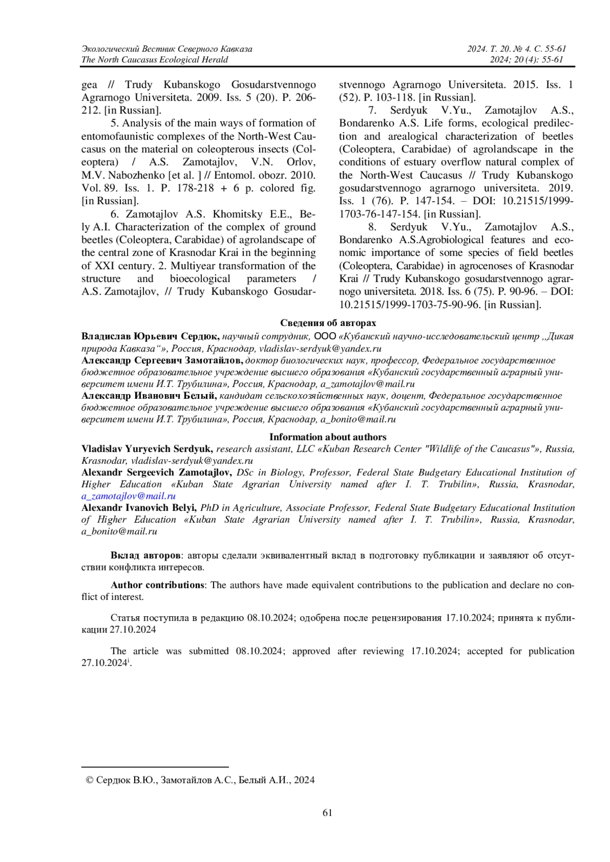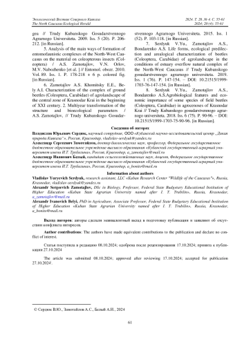 Ключевые фразы: жужелицы, Carabidae, агроландшафты, консортные связи, вредители сельскохозяйственных культур, славянский район, Краснодарский край