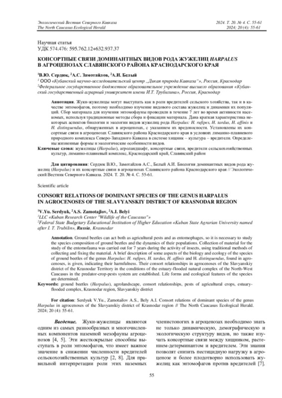 Статья: Консортные связи доминантных видов рода жужелиц Harpalus в агроценозах Славянского района Краснодарского края (2024)