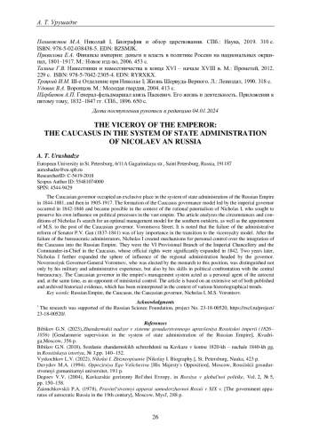 УРУШАДЗЕ А. Т. НАМЕСТНИК ИМПЕРАТОРА: КАВКАЗ В СИСТЕМЕ ГОСУДАРСТВЕННОГО УПРАВЛЕНИЯ НИКОЛАЕВСКОЙ РОССИИ // ВЕСТНИК ПЕРМСКОГО УНИВЕРСИТЕТА. ИСТОРИЯ. 2025. № 2 (69)
