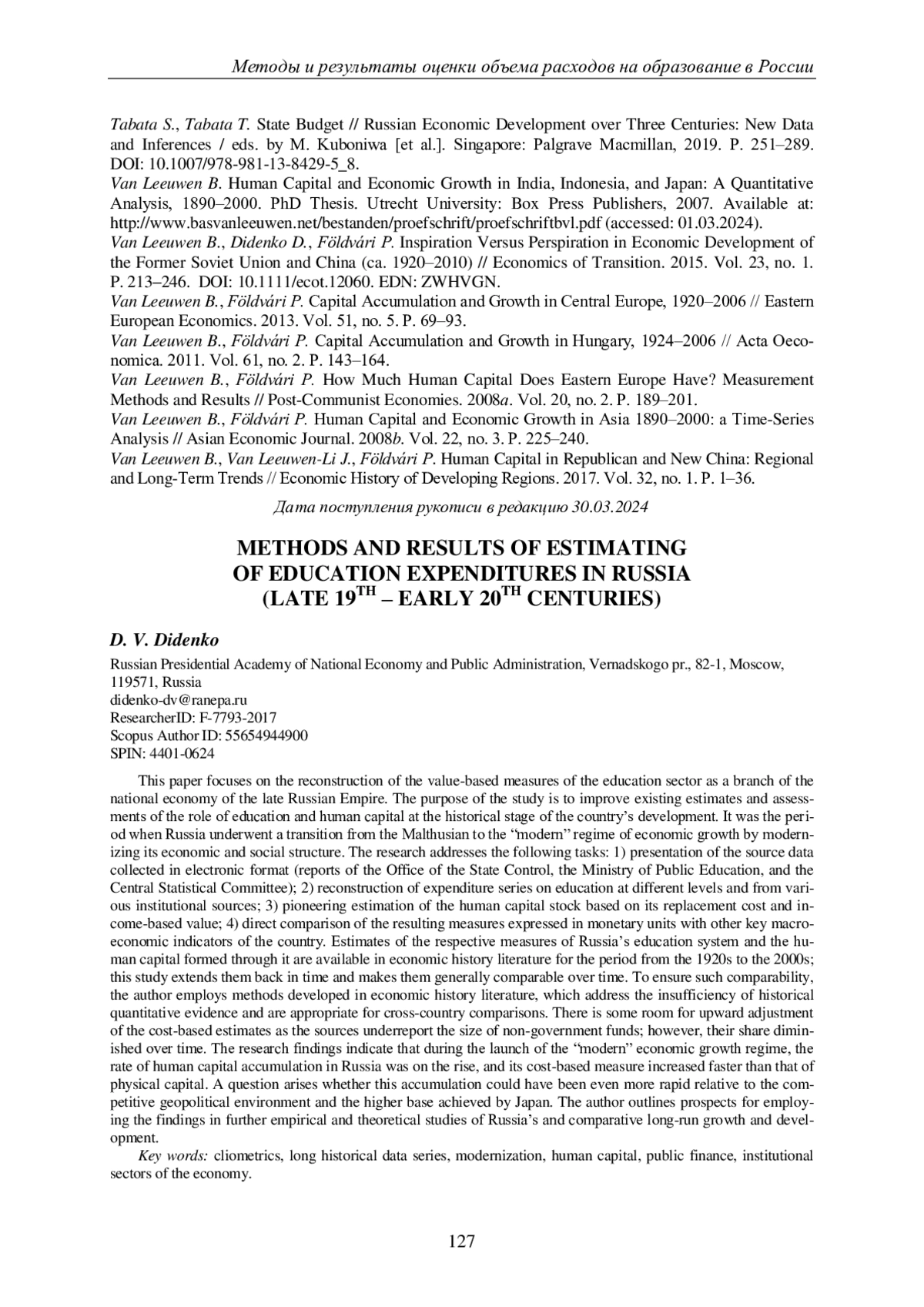 Статья: МЕТОДЫ И РЕЗУЛЬТАТЫ ОЦЕНКИ ОБЪЕМА РАСХОДОВ НА ОБРАЗОВАНИЕ В РОССИИ (КОНЕЦ XIX - НАЧАЛО XX ВЕКА) (2025)