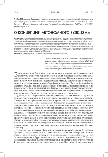 Будучи по своей природе социальным феноменом, буддизм каждый раз трансформируется для того, чтобы наилучшим образом отвечать потребностям и запросам того или иного общества на том или ином этапе его развития. В настоящее время в Бурятии обретает очертания уникальное религиозное явление, которое можно обозначить как «автономный» буддизм. Доказав свою эффективность в России, он может и должен быть оформлен в виде концепции, пригодной к трансляции на зарубежную аудиторию, и стать визитной карточкой Бурятии.