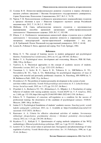 6. Дьячук А. А., Бочарова Ю. Ю., Климацкая Л. Г., Шпаков А. И. Особенности совладающего поведения студентов с различной академической успешностью // Вестник КГПУ им. В. П. Астафьева. 2022. № 2 (60). С. 132-150. https://doi.org/10.25146/1995-0861-2022-60-2-339.
