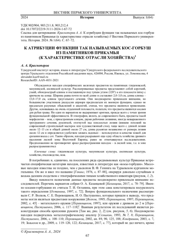 В погребениях и, единично, на поселениях ряда средневековых культур Прикамья встречается специфическая категория находок, известных в литературе как «косы-горбуши». Массовые находки известны не позднее, чем с раскопок В. Ф. Генинга на Тураевском курганном могильнике. Он же и ввел это название [Генинг, 1976, с. 87‒88], оперируя довольно случайным и весьма далеким сходством с этнографическими типами хозяйственного инвентаря (рисунок, 1, 2).