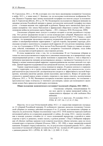 Отечественная война 1812 г. является одним из важнейших событий для всей истории Российской империи и одним из самых исследованных периодов в ней. Преимущественно историографический фокус смещен на военно-политическую историю Отечественной войны, в том числе среди исследователей, занимающихся исключительно Смоленской губернией. В основном научная литература посвящена положению данной губернии в период войны 1812 г. Период же ее восстановления является практически не проанализированным, хотя и привлекает внимание исследователей в рамках общей истории Смоленщины уже с позднеимперского периода [Вороновский, 1912; Грачев, 1912; Андреев, 1940]. Здесь надо отметить работы современных смоленских историков [Кононов, 2004; Никитина, 2009, 2010, 2020], чьи исследования, однако, базируются преимущественно на историографии ХХ в., документах Смоленского архива (ГАСО), а история губернии рассматривается в отрыве от общеимперского контекста.