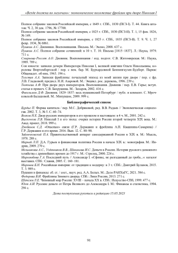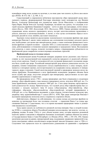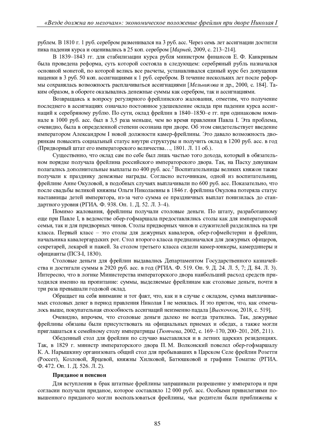Финансовое благополучие - неотъемлемая часть презентации роскошной жизни дворянства. Экономическое состояние дворянина включало в себя доход с имения, накопление капиталов и жалование на службе. Дворянки также могли приобретать денежные средства за счет имения (наследственного, приданого или купленного), но в государственной службе они были ограничены. Однако придворный женский штат получил возможность оплаты своей службы при дворе. Во время правления императора Николая I (1825-1855) основной и самой массовой женской придворной должностью являлись фрейлины, которые получали как социальный статус (приближенность к императорской семье), так и финансовое обеспечение (жалование и другие выплаты). В статье на основе многочисленных материалов (законодательных актов, делопроизводственных документов Министерства императорского двора и источников личного происхождения) рассматривается экономическое положение дворянок на фрейлинской службе, исследуется соотношение полученных от службы доходов и расходов, необходимых для ведения достойной жизни при императорском дворе и в столице. Автор анализирует изменение финансового положения фрейлин в первой половине - середине XIX в. и сопоставляет последнее со стандартами, принятыми для мужских придворных и гражданских чинов империи. Важное значение в статье отводится формированию жизненных стратегий фрейлин, которые способствуют получению дополнительных доходов, для продвижения внутри придворной иерархии. Исследовательница приходит к выводу о поликомпонентности содержания фрейлин и сопоставимости сумм, выделяемых представительницам женского придворного штата, с доходами мужчин, состоявших при дворе и на гражданской службе.