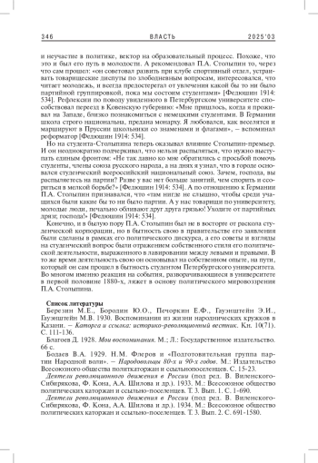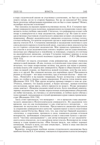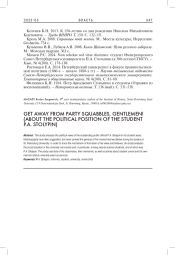 МАЗАЕВ Р. С. УХОДИТЕ ОТ ПАРТИЙНЫХ ДРЯЗГ, ГОСПОДА! (О ПОЛИТИЧЕСКОЙ ПОЗИЦИИ СТУДЕНТА П. А. СТОЛЫПИНА) // ВЛАСТЬ. 2025. ТОМ 33 № 3