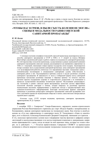 С помощью изучения специфики технологий советской пропаганды анализируются места и способы санитарного просвещения в СССР в 1920-е гг. С опорой на подход Штефана Плаггенборга аналитический акцент в работе ставится на модальности санитарной пропаганды. Из этой перспективы технология пропаганды, осуществляемая в рамках проводимой кампании санитарного просвещения советских граждан, рассматривается как проявление современных на 1920-е гг. тенденций, отвечающих новым нормам государства эпохи модерна. Анализируются четыре основных места осуществления санитарной пропаганды: дома санитарного просвещения с их мультиформатной работой, агитпоезда и их передвижные выставки, театральные сцены с гигиеническими постановками и специальными санитарными судами, избы-читальни и санитарная работа в них. Рассматриваются причины успехов и неудач различных способов санитарного просвещения. В зависимости от места и избираемой формы метод санитарной пропаганды использовал различные языковые и образные приемы: это помогло сместить изучение практик поддержания здоровья от теоретического осмысления к их пониманию в процессах осуществления ежедневных человеческих практик2. Исследование демонстрирует, как постепенно в раннее советское время выстраивалась целостная система эффективных технологий обучения санитарии и гигиене, которая опиралась на различные практики медикализации населения, перформативные и творческие методы и предшествующий опыт социально-политического информирования. Благодаря используемым формам санитарной пропаганды и различным репертуарам санитарного просвещения советский трудящийся смог стать участником процессов медикализации общества и начать самостоятельно интересоваться охраной своего здоровья.