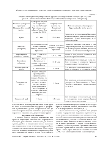 Цель исследования - выявление наиболее острых проблем, связанных с рекреационным природопользованием приморских туристических территорий, и разработка рекомендаций по их решению или смягчению. Материалы и методы. Исследование охватывает наиболее популярные приморские территории России. Использован сравнительно-описательный метод, SWOT-анализ, метод дедукции для отражения его результатов, проведена оценка рекреационной емкости береговой зоны. Результаты и обсуждение. Развитие туризма в приморских регионах сдерживается несовершенством законодательства, опасными природными явлениями, неэффективным управлением, конфликтами природопользования в целом. Эффективное стратегическое планирование, в частности, развитие новых видов туризма способствует перераспределению туристических потоков в пространстве и во времени, что позволит снизить нагрузку на природные ландшафты и инфраструктуру. Необходимы конкретные меры законодательной поддержки новых видов туризма. Выводы. Для предотвращения негативных последствий ожидаемого роста туристического потока рекомендуется использовать механизмы стратегического планирования: комплексные оценки рекреационного потенциала, мониторинг антропогенной нагрузки, совершенствование нормативно-правовой базы.