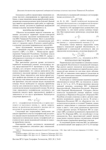 Цель - оценка динамики доступности первичной медико-санитарной помощи сельскому населению Чувашской Республики за 2019 и 2024 гг. Материалы и методы. Анализ проведен с точки зрения трех аспектов: кадровая или медицинская обеспеченность, географическая и комплексная доступность медицинской помощи. Основные расчеты проведены с применением матричного метода, а после вычислен темп прироста по каждому из муниципальных округов Чувашии относительно каждого аспекта в выделенном временном промежутке. Материалы для проведения исследования получены в центральных районных больницах и Министерстве здравоохранения Чувашской Республики. Результаты и обсуждение. Выделено три группы муниципальных округов на основе темпа прироста комплексной доступности первичной медицинской помощи сельскому населению Чувашии. К группе со значительным падением темпа прироста показателя причислено 9 муниципальных округов, где показатель варьируется от -15 % до -44 %. В категории с незначительным падением данного показателя отнесено 7 муниципальных округов, где наблюдается диапазон значений от -0,1 % до -14 %. К следующей группе причислено 5 муниципальных округов, где наблюдается незначительный прирост показателя комплексной доступности, где показатели в диапазоне от 0 % до 14 %. Наибольшее падение данного показателя зафиксирован в муниципальных округах, которые наибольшим образом подверглись процессу оптимизации. Выводы. Выяснилось, что в подавляющем большинстве муниципальных округов наблюдается отрицательная динамика показателя комплексной доступности первичной медицинской помощи. В первую очередь это вызвано снижением темпа прироста географической доступности. Однако менее негативная тенденция относительно динамики показателей кадровой обеспеченности объясняется увеличением нагрузки при лечении большинства групп заболеваний на терапевтов и врачей общей практики.