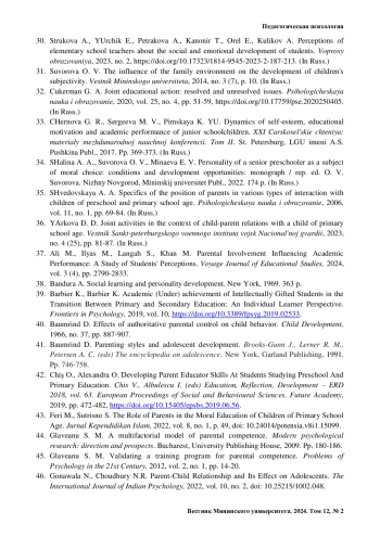 14. Карабанова О. А. В поисках оптимального стиля родительского воспитания // Национальный психологический журнал. 2019. № 3 (35). С. 71-79. https://doi.org/10.11621/npj.2019.0308.