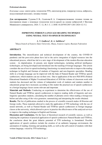 Введение. Интенсификация и техническое развитие страны, пандемия COVID-19 и постковидный этап вызвали активную интеграцию цифровых средств в образовательный процесс, что привело к новому этапу развития современной российской системы образования – её цифровизации. В настоящее время разрабатываются и внедряются в обучение иностранным языкам новые цифровые технологии, в т. ч. технологии искусственного интеллекта. Данная статья рассматривает применение технологии text-to-speech с использованием нейросетей для совершенствования техники чтения на английском и немецком языках студентов языковых и неязыковых специальностей. Навыки чтения вслух на иностранном языке можно совершенствовать с помощью синтезаторов речи Natural Reader и TTSFree, которые студенты могут использовать в автономной работе. В силу издания в 2018 года нового ФГОС ВПО, приведшего к уменьшению объема аудиторной работы со студентами, увеличению объема самостоятельной работы студентов и к увеличению наполняемости учебных групп, практическое использование синтезаторов речи на занятиях по иностранному языку представляется актуальным и важным.