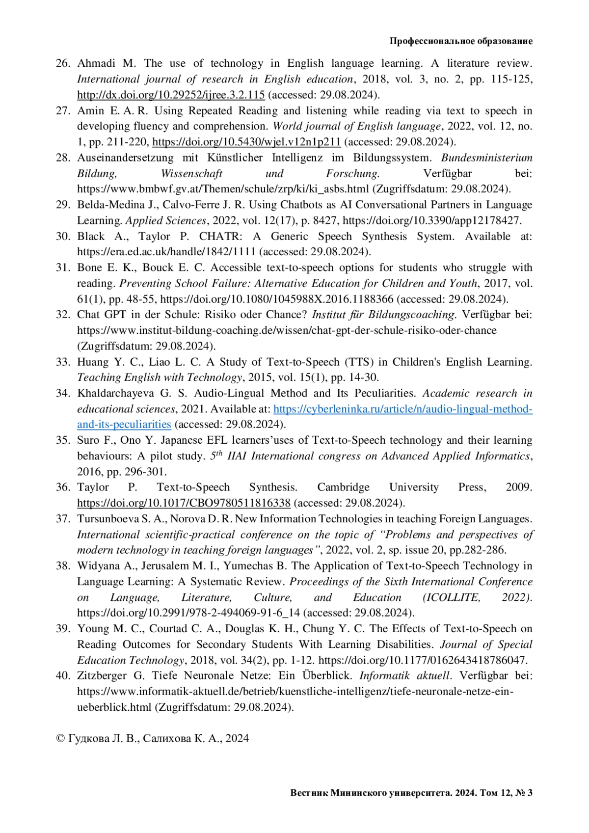 38. Widyana A., Jerusalem M. I., Yumechas B. The Application of Text-to-Speech Technology in Language Learning : A Systematic Review // Proceedings of the Sixth International Conference on Language, Literature, Culture, and Education (ICOLLITE, 2022). https://doi.org/10.2991/978-2-494069-91-6_14 (accessed: 29. 08. 2024).