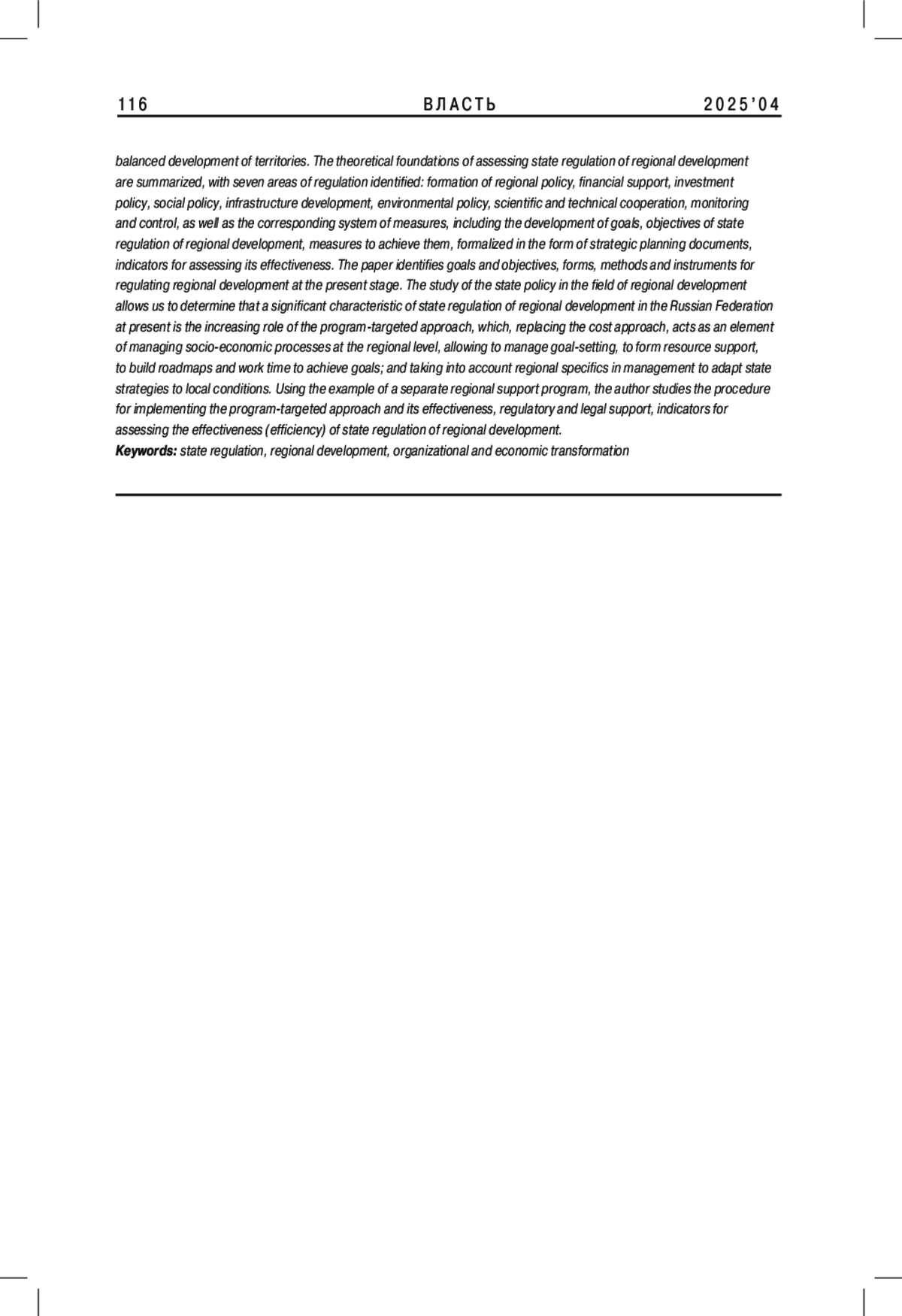 Тема государственного регулирования регионального развития раскрывается с позиции теории и практики государственного управления, снижения социально-экономического неравенства отдельных регионов страны и достижения сбалансированного развития территорий. Автор обобщает теоретические основы оценки государственного регулирования регионального развития и выделяет семь направлений регулирования: формирование региональной политики, финансовую поддержку, инвестиционную политику, социальную политику, развитие инфраструктуры, экологическую политику, научно-техническое сотрудничество, мониторинг и контроль, а также соответствующую систему мер, включая выработку целей, задач государственного регулирования регионального развития, мероприятий по их достижению, формализованную в виде документов стратегического планирования, показателей оценки его эффективности. В статье выделяются цели и задачи, формы, методы и инструменты регулирования регионального развития на современном этапе. Значимой характеристикой государственного регулирования регионального развития в РФ в настоящее время является увеличение роли программно-целевого подхода, который, заменяя затратный подход, выступает элементом управления социально-экономическими процессами на уровне регионов, позволяя управлять целеполаганием, формировать ресурсное сопровождение, выстраивать дорожные карты и время работ по достижению целей, учитывать региональную специфику при управлении, адаптировать государственные стратегии к местному заделу. На примере отдельной региональной программы поддержки автор изучает порядок реализации программно-целевого подхода и его результативность, нормативно-правовое сопровождение, индикаторы оценки эффективности (результативности) государственного регулирования регионального развития.