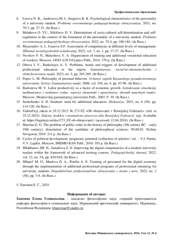 9. Малахова О. Ю., Никифоров Д. В. Детерминированность социокультурного самоопределения и саморегуляции в контексте становления личности студента вуза // Проблемы современного педагогического образования. 2022. № 75-4. С. 180-184.