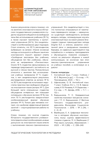 4. Вербицкая, Е. А. Цифровые технологии в методике обучения иностранному языку: оценка эффективности глазами студента / Е. А. Вербицкая // Мир науки, культуры, образования. - 2023. - № 2 (99). - С. 238-240.