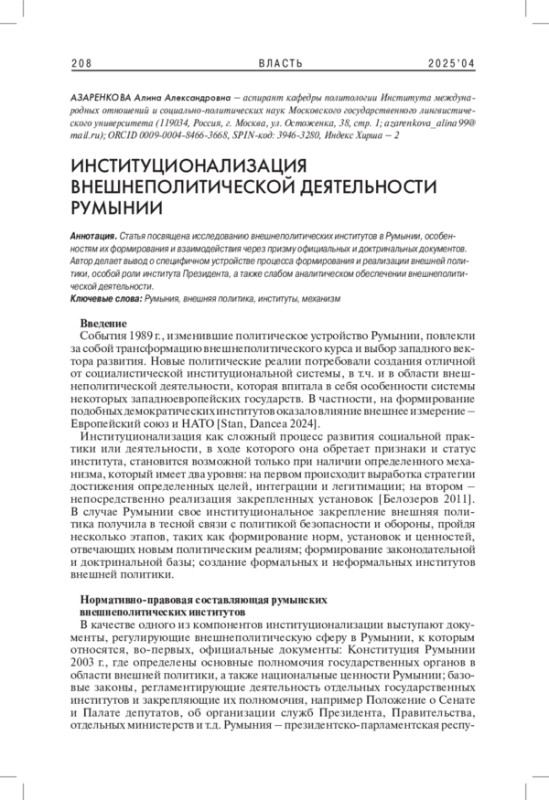 Статья посвящена исследованию внешнеполитических институтов в Румынии, особенностям их формирования и взаимодействия через призму официальных и доктринальных документов. Автор делает вывод о специфичном устройстве процесса формирования и реализации внешней политики, особой роли института Президента, а также слабом аналитическом обеспечении внешнеполитической деятельности.