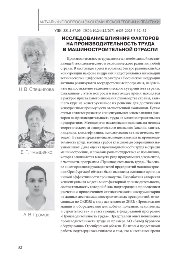 Производительность труда является необходимой составляющей технологического и экономического развития любой страны. В настоящее время в условиях быстро развивающейся конкуренции на фоне внедрения индустриальных инноваций технического и цифрового характера в Российской Федерации активно реализуются государственные программы, нацеленные на достижение технологического суверенитета страны. Связанные с этим вопросы в настоящее время находятся в ракурсе пристального внимания руководства страны, взявшего курс на конструктивное их решение для достижения конкурентных преимуществ отечественной экономики. Целью статьи является развитие концептуальных основ влияния факторов на производительность труда на машиностроительных предприятиях. Методология исследования основана на методах теоретического и эмпирического познания (анализ, синтез, индукция, классификация, использование статистических методов). В статье представлена эволюция взглядов на производительность труда, начиная с работ классиков до современных научных школ. Дана оценка производительности труда в отрасли машиностроения, и показана роль государства в ее повышении, которая заключается в запуске ряда программных документов, в частности, программы «Производительность труда». На основе анкетирования руководителей предприятий машиностроения Оренбургской области были выявлены основные причины низкой эффективности производства. Разработана авторская концептуальная модель многофакторной производительности, состоятельность которой была подтверждена проведением расчетов с привлечением статистического инструментария на данных десяти машиностроительных предприятий, относящихся по ОКВЭД к виду деятельности 28.92: «Производство машин и оборудования для добычи полезных ископаемых и строительства» и участвующих в федеральной программе «Производительность труда». Представлен опыт повышения производительности труда на примере АО «Завод бурового оборудования» Оренбургской области. По итогам проделанной работы подтвердилась гипотеза о том, что в настоящее время на производительность труда влияет большое количество факторов, в числе которых капитал, инвестиции, инновации, основные средства, труд. Сделан вывод, что, учитывая значимость машиностроения и наличие множества актуальных проблем, требуется и дальнейшее осуществление государственной поддержки отраслевых предприятий. Выявленные в результате исследования причины низкой производительности труда позволили сделать вывод о низком качестве управления, что требует дополнительного внимания руководителей предприятий к данной проблеме.