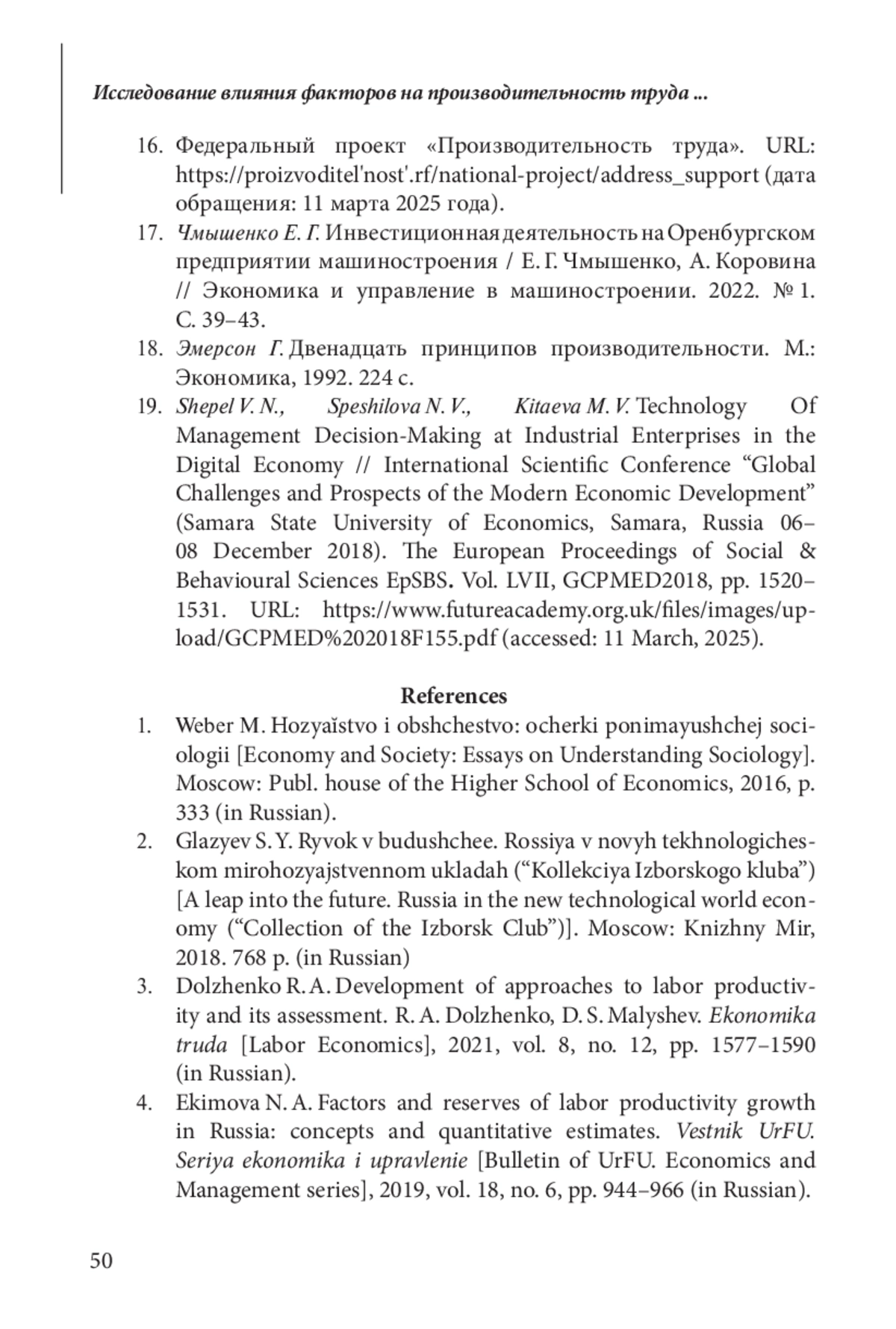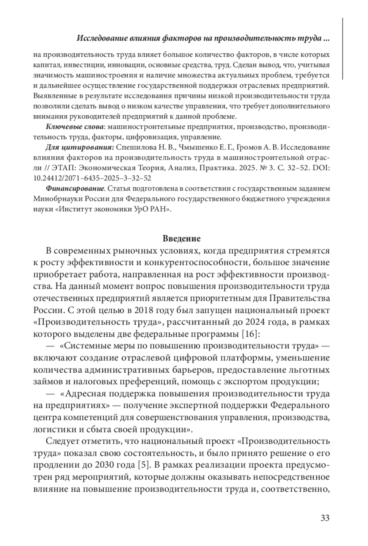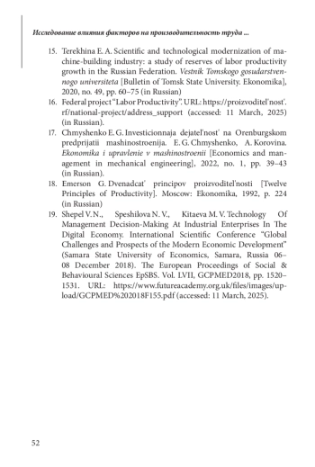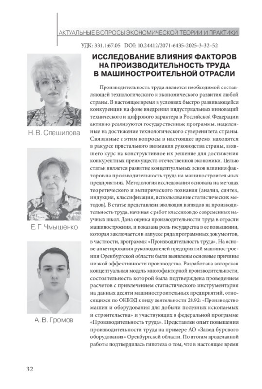 СПЕШИЛОВА Н. В., ЧМЫШЕНКО Е. Г., ГРОМОВ А.В. ИССЛЕДОВАНИЕ ВЛИЯНИЯ ФАКТОРОВ НА ПРОИЗВОДИТЕЛЬНОСТЬ ТРУДА В МАШИНОСТРОИТЕЛЬНОЙ ОТРАСЛИ // ЭТАП: ЭКОНОМИЧЕСКАЯ ТЕОРИЯ, АНАЛИЗ, ПРАКТИКА. 2025. № 3