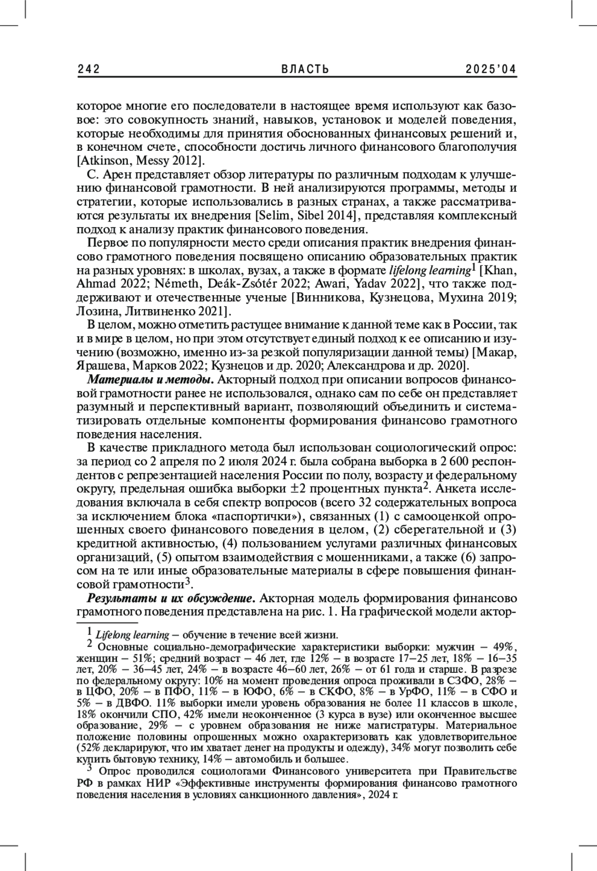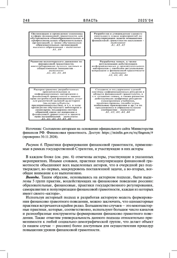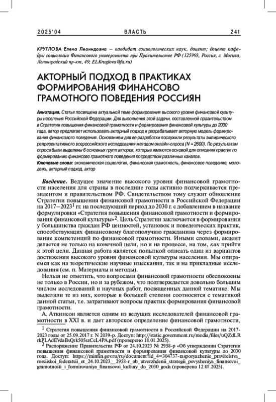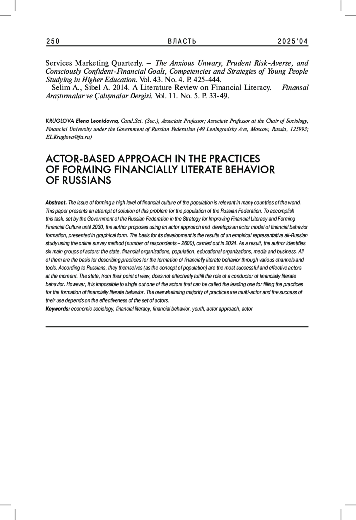 Статья посвящена актуальной теме формирования высокого уровня финансовой культуры населения Российской Федерации. Для выполнения этой задачи, поставленной правительством в Стратегии повышения финансовой грамотности и формирования финансовой культуры до 2030 года, автор предлагает использовать акторный подход и разрабатывает акторную модель формирования финансового поведения. Основанием для ее разработки послужили результаты эмпирического репрезентативного всероссийского исследования методом онлайн-опроса (N = 2600). По результатам опроса были выделены 6 основных групп акторов, которые являются основой для описания практик по формированию финансово грамотного поведения посредством различных каналов.