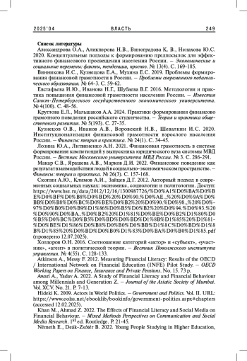 1. Александрова О.А., Аликперова Н.В., Виноградова К. В., Ненахова Ю.С. 2020. Концептуальные подходы к формированию предпосылок для эффективного финансового просвещения населения России. - Экономические и социальные перемены: факты, тенденции, прогноз. № 13(4). С. 169-185.